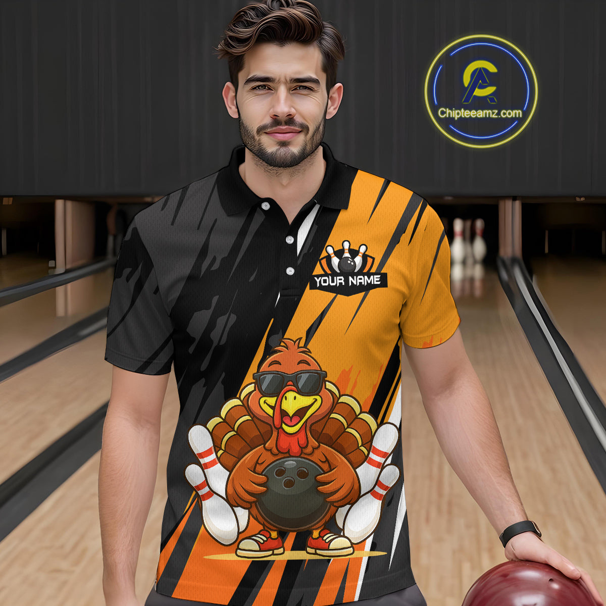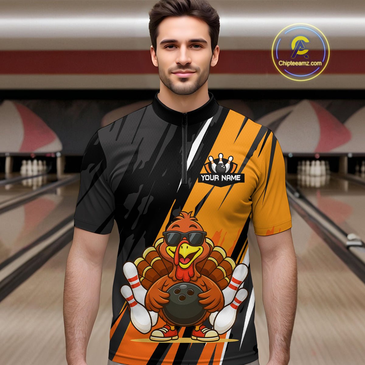 Custom Orange Funny Turkey Bowling Jersey for Men Polo & 1/4 Zip Thanksgiving Bowling Team Shirts HNT124