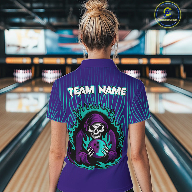 Custom Purple and Blue Flame Skull Reaper Bowling Shirts For Women, Personalized Team Bowling outfits NQS11030