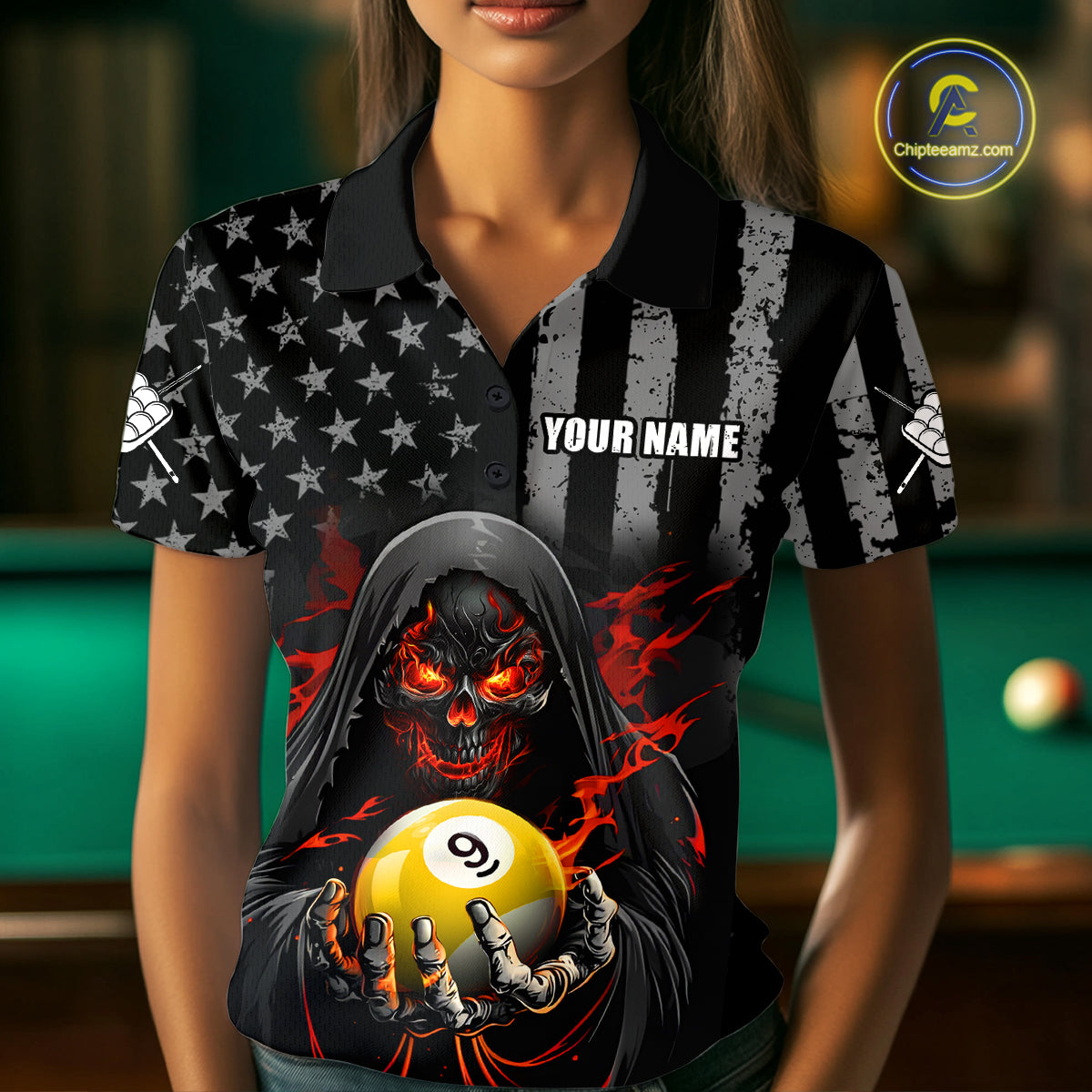 Custom US Skull 9 Ball Billiard Shirts for Women Billiard Team Shirts Billiard League Polo & 1/4 Zip NNT94
