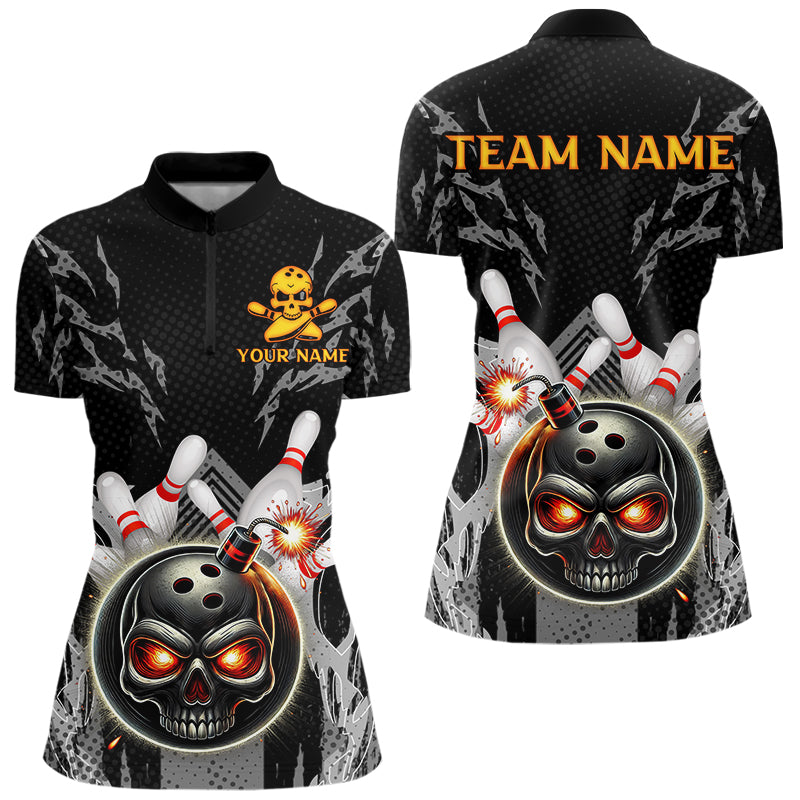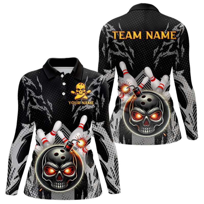 Funny Black and Gray Camo Bowling Shirt For Women Custom Skull Bowling Bomb Team ladies bowling attire NQS9792