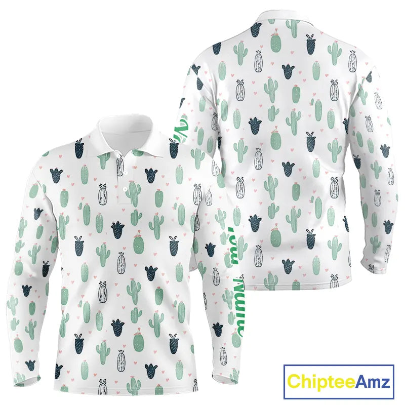 Funny Cactus Flower Pattern Long Sleeve Golf Polo Shirt Custom, Cactus Golf Shirt Personalized NHN0151