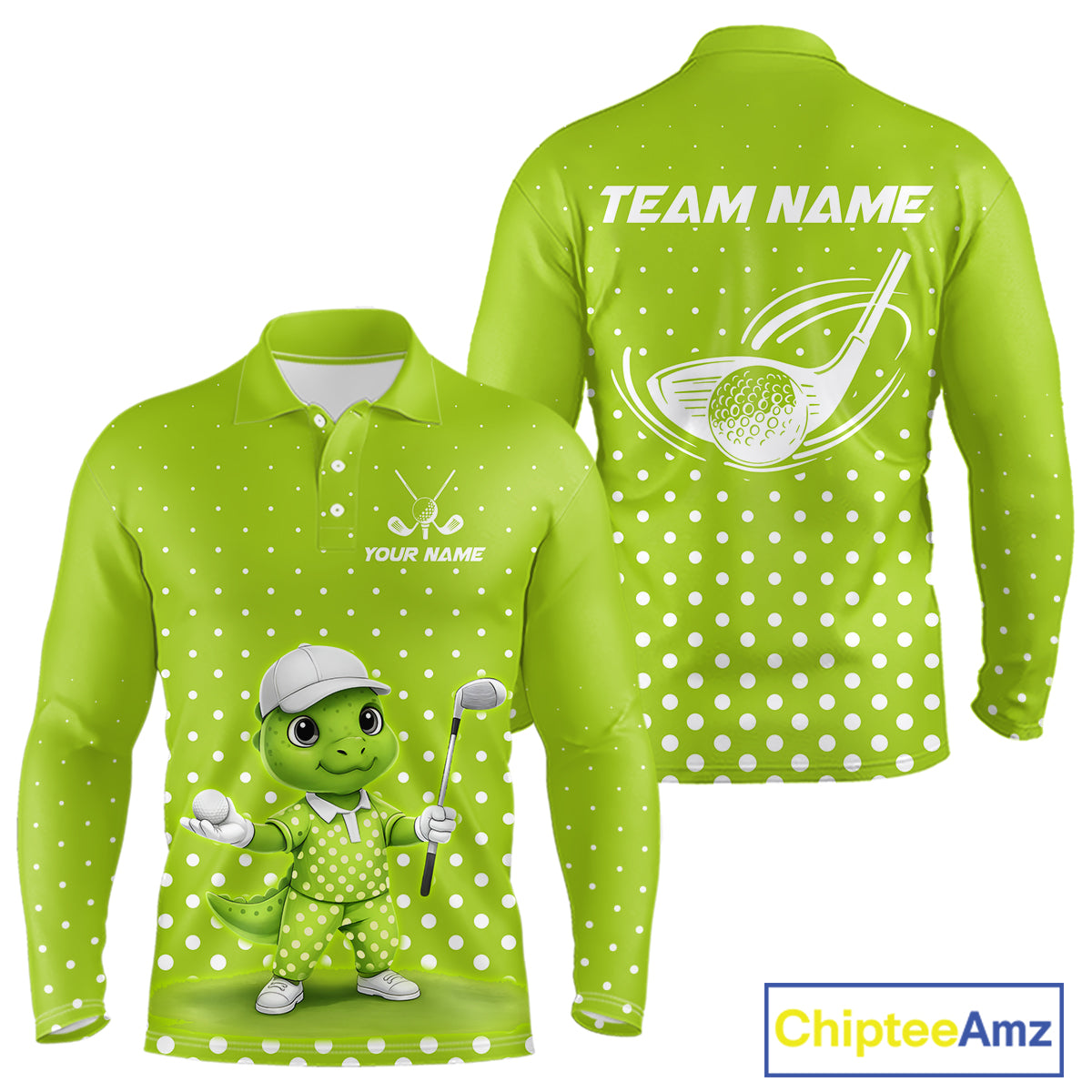 Funny Dinosaur Long Sleeve Golf Polo Shirt Green Pattern Custom Dinosaur Golf Shirts For Men NHN0100