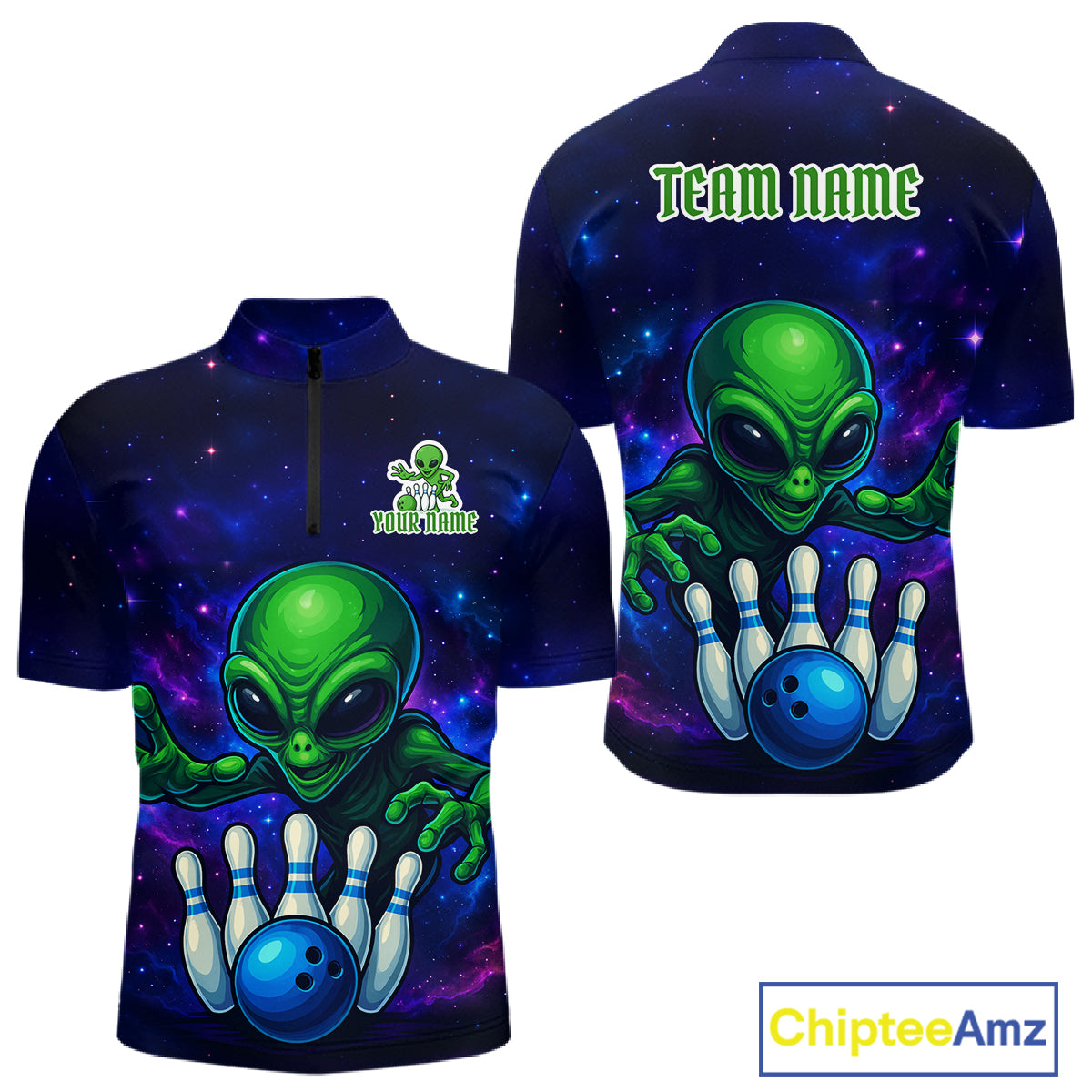 Funny Galaxy Alien Bowling Polo, 1/4 Zip Shirt For Men Custom Bowling Team Outfit, Gift For Bowler NQS10729
