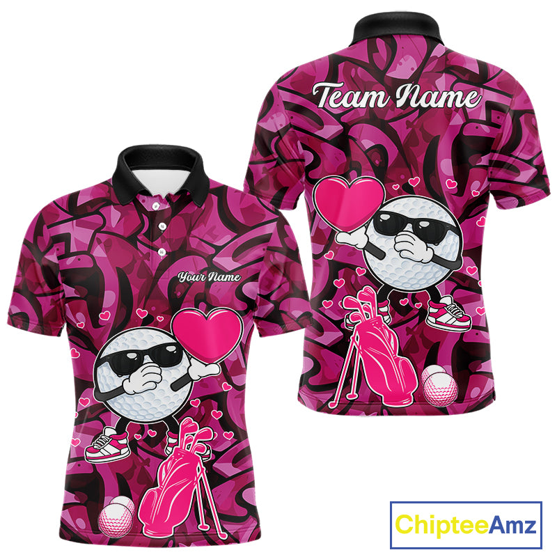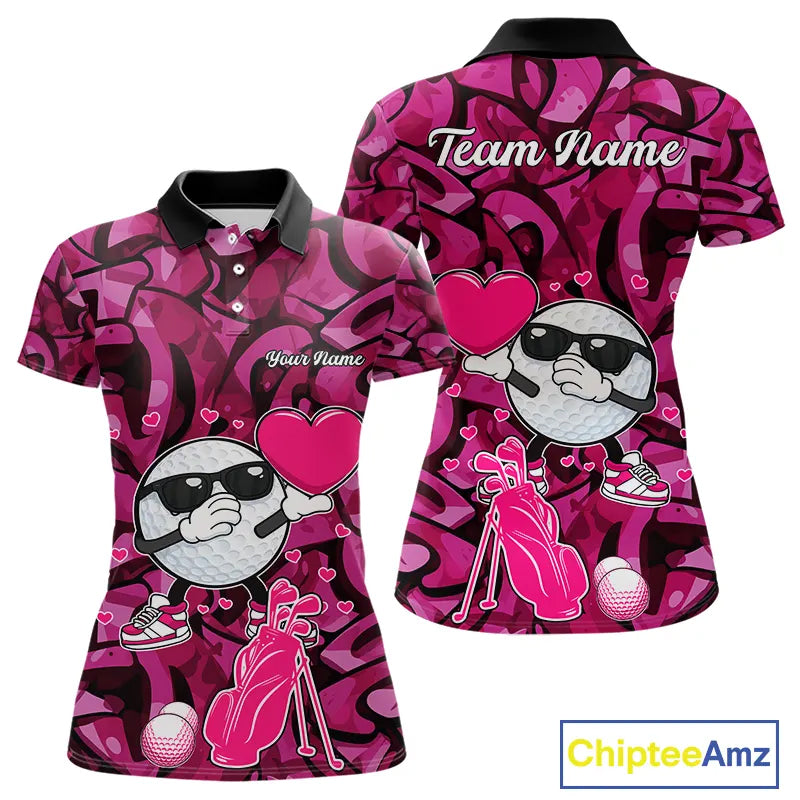 Funny Golf ball heart pink graffiti pattern Custom Valentine matching golf polo shirts for couples NQS11323