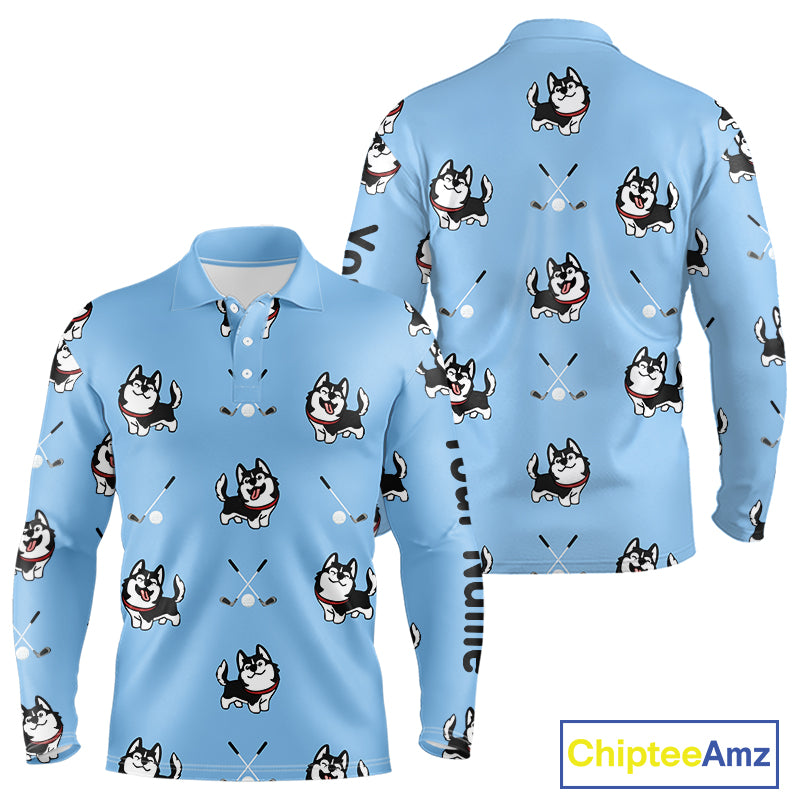 Funny Husky Mens Long Sleeve Golf Polo Shirt Custom Blue Golf Clubs Golf Team Shirt, Dog Lover Gift NHN0065