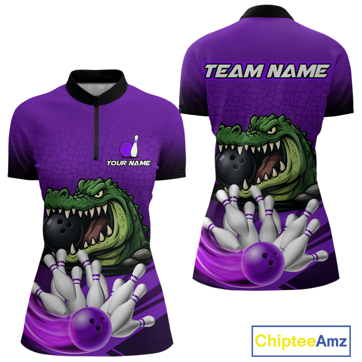 Funny Purple Alligator Bowling Polo, Quarter Zip shirts for Women Custom Team bowling league jersey NQS10631