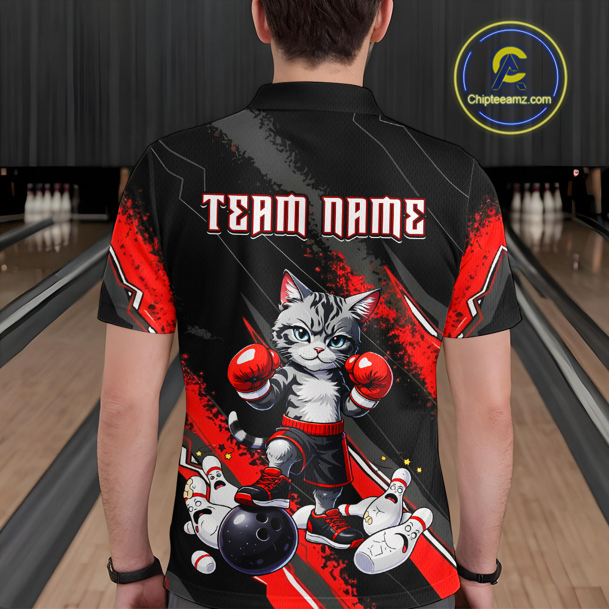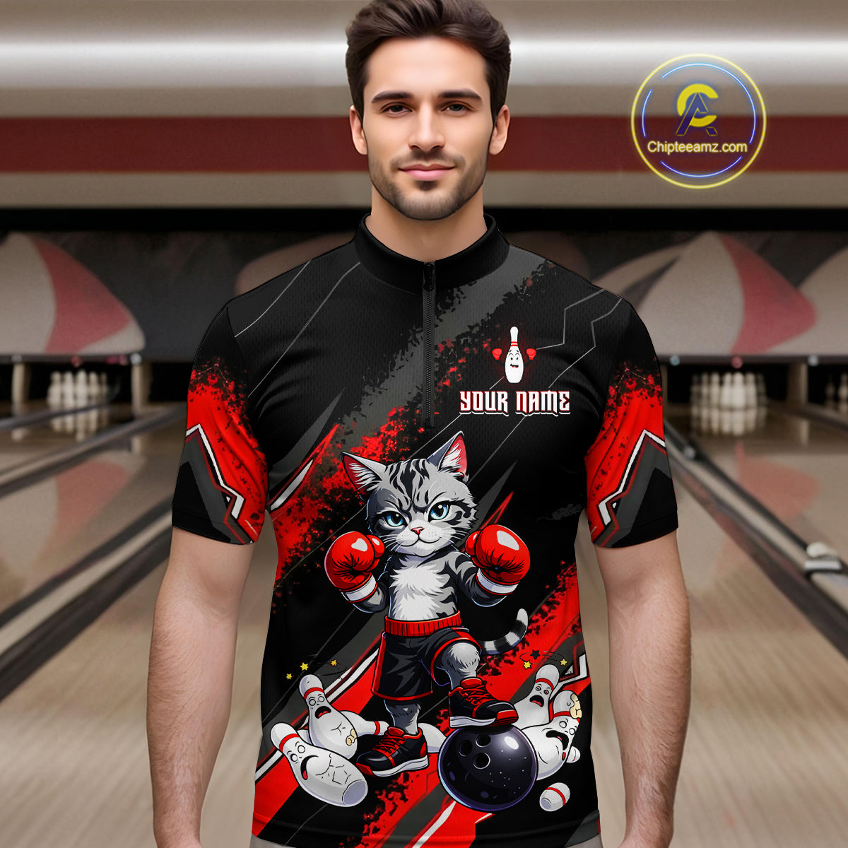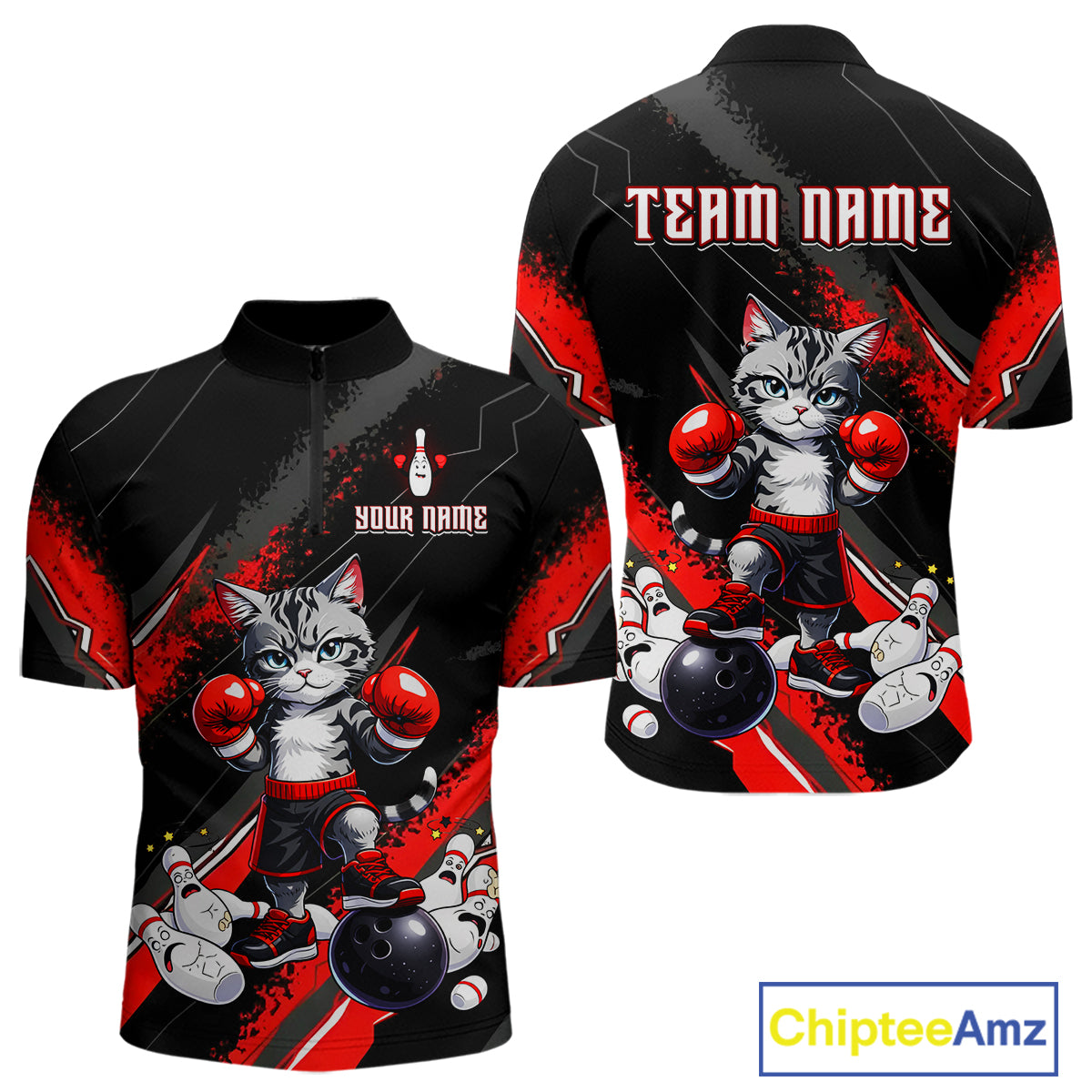 Funny Red Cat Boxing Bowling Team Jersey Personalized Polo & 1/4 Zip Shirt for Men Bowling League QZT825