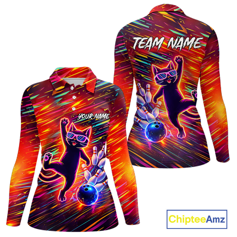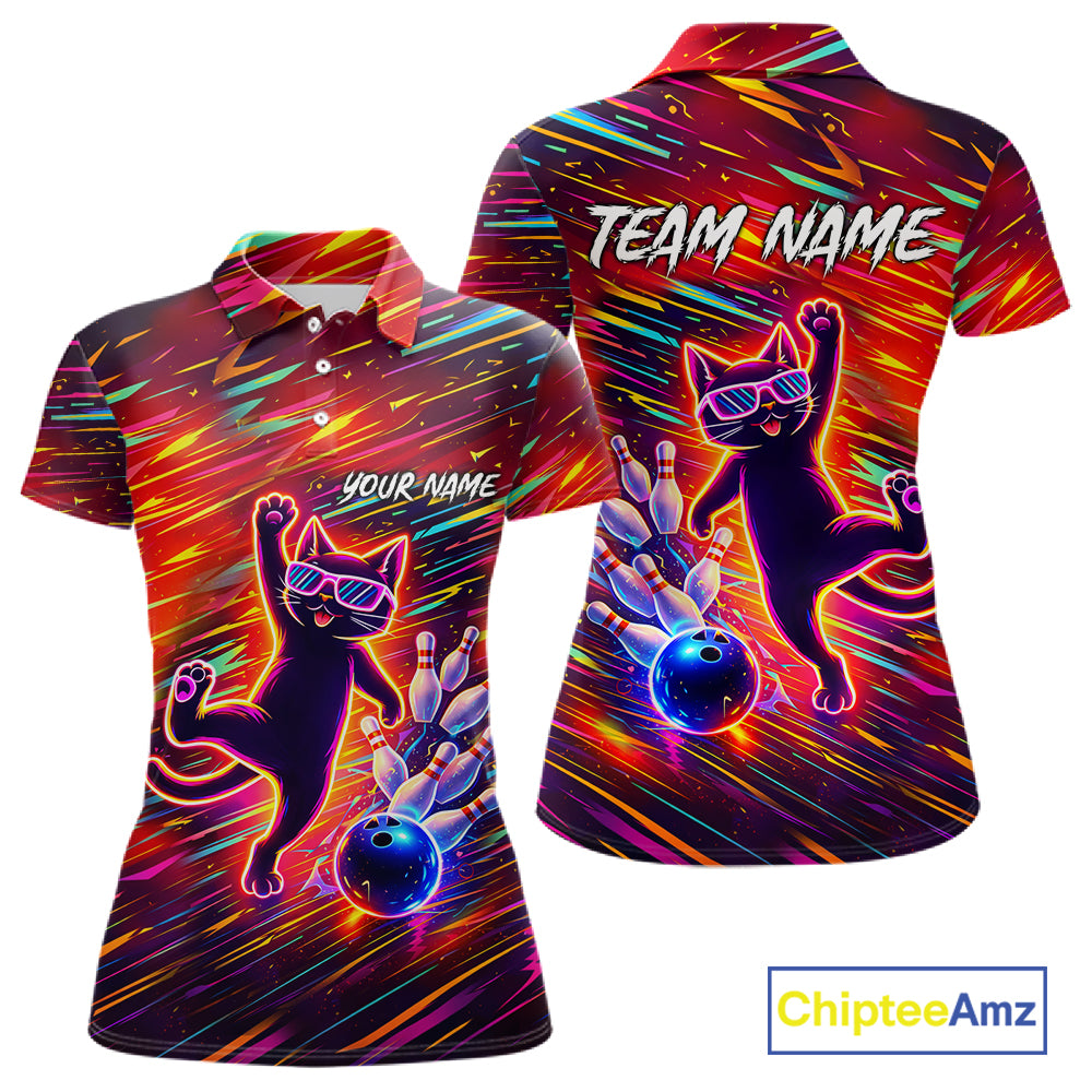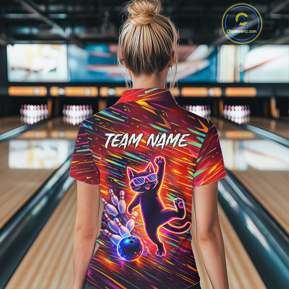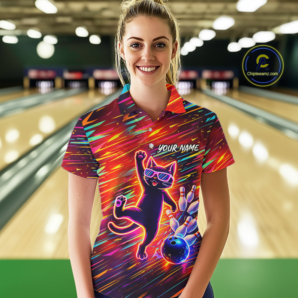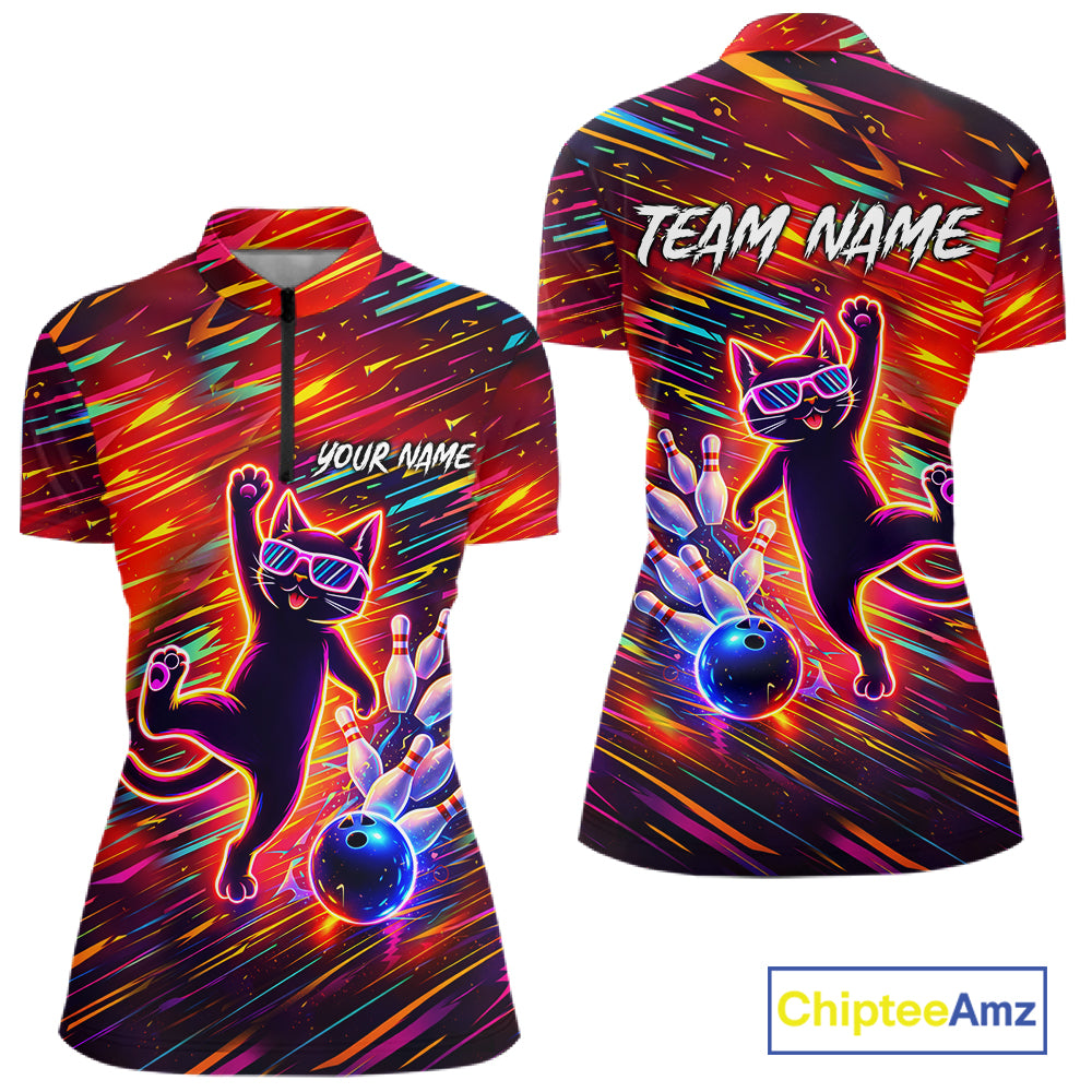 Funny Colorful Neon Cat Bowling Polo shirt, 1/4 zip shirts for Women custom Bowling Team League Shirt NQS11429