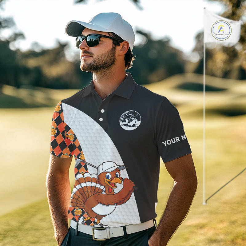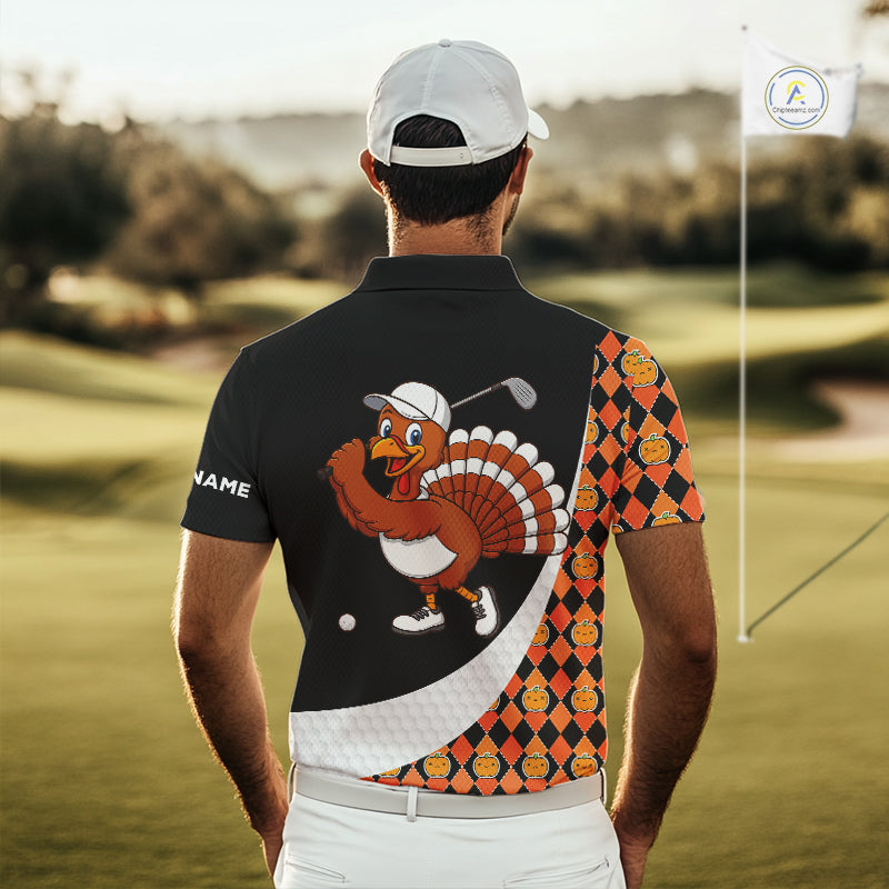 Golf Turkey Thanksgiving Mens Polo Shirt Orange Pumpkin argyle pattern Custom Golf outfit For Men NQS10839