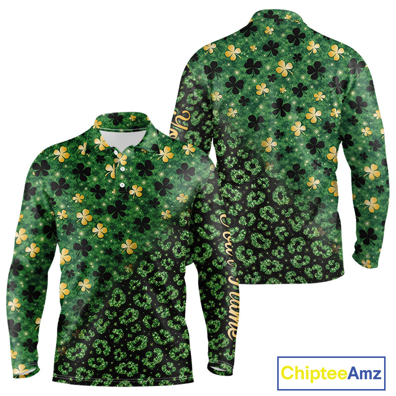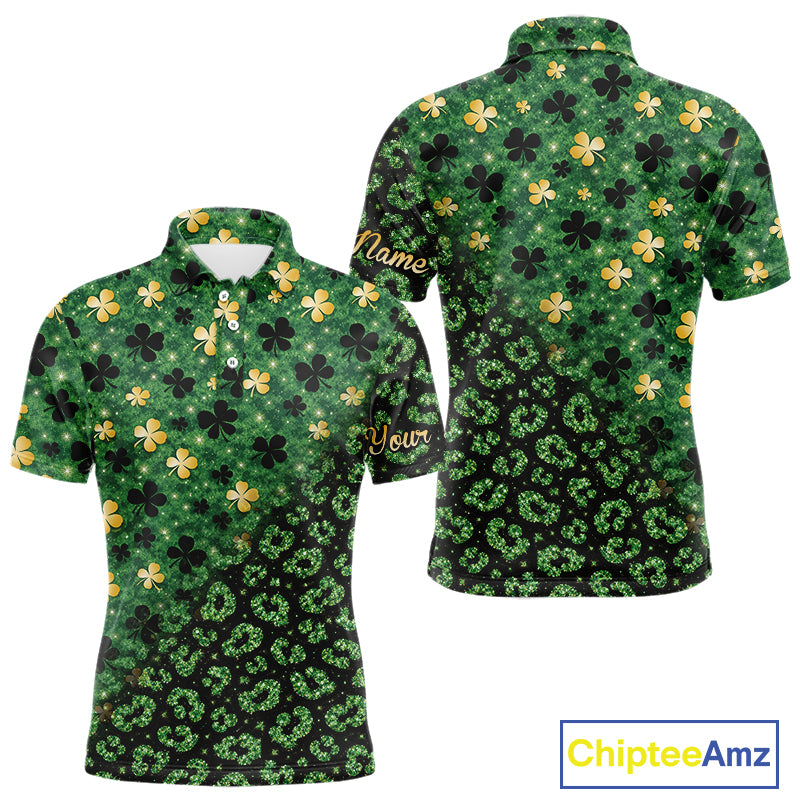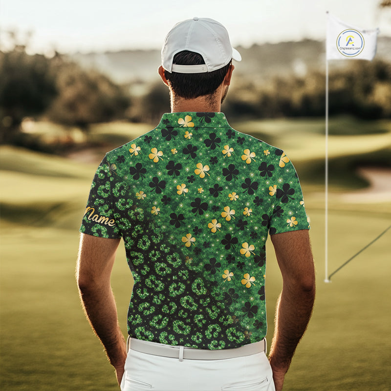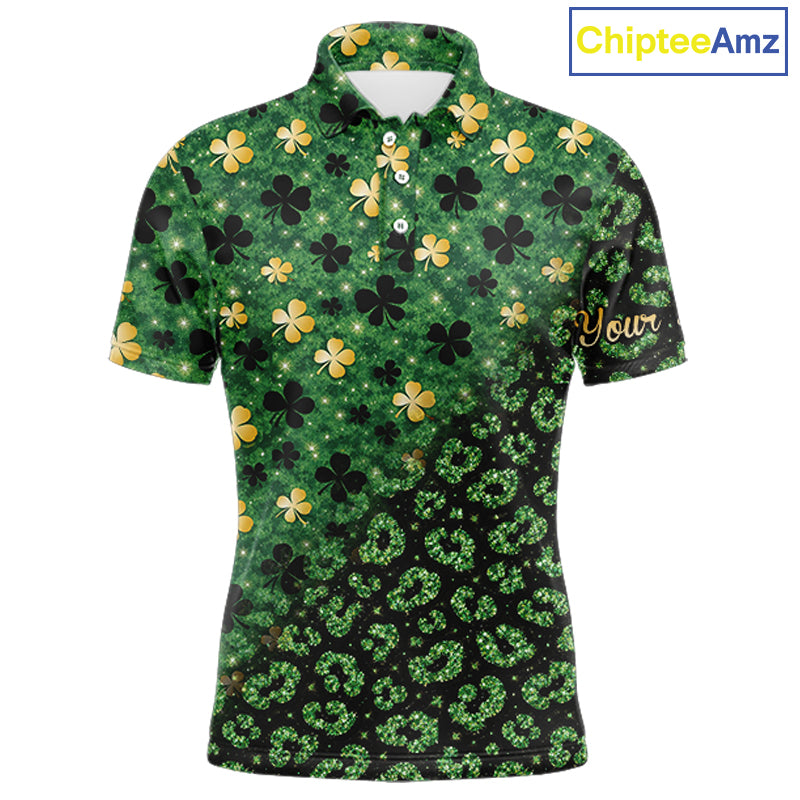 Green and Gold Clover glitter leopard St Patrick's day pattern custom shamrock Mens golf polo shirts NQS11423