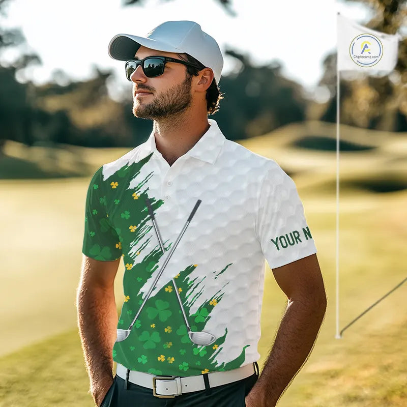 Green clover pattern St Patrick's day custom white Mens golf polo shirts, team mens golf tops NQS11421