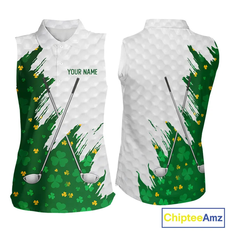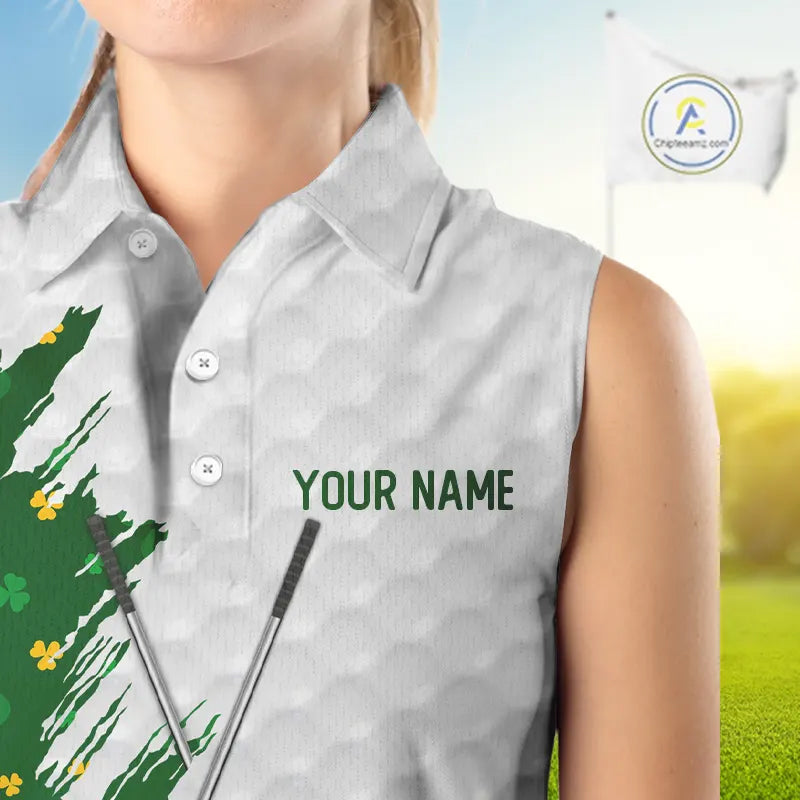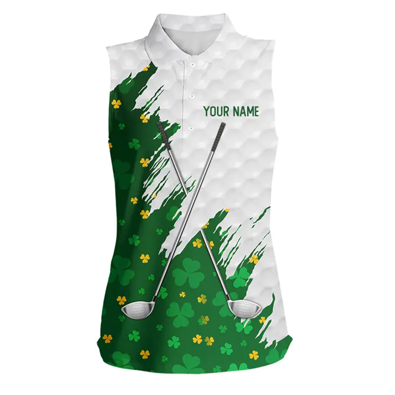 Green clover pattern St Patrick's day custom white Women Sleeveless polos, team ladies golf tops NQS11421