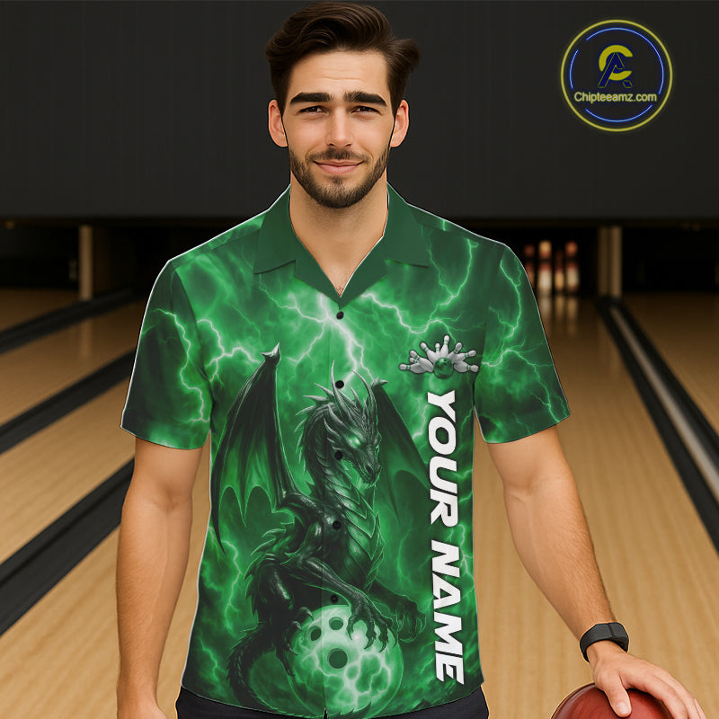 Custom Green Thunder Lightning Bowling Team Men And Women Hawaiian Shirt, Dragon Bowling Jerseys IPHW10199