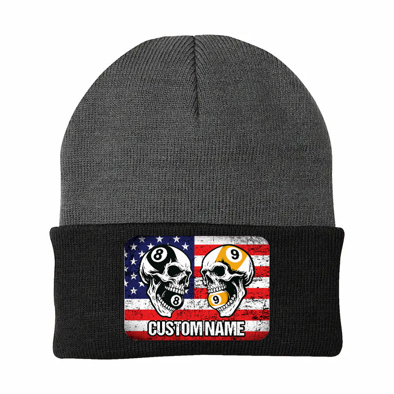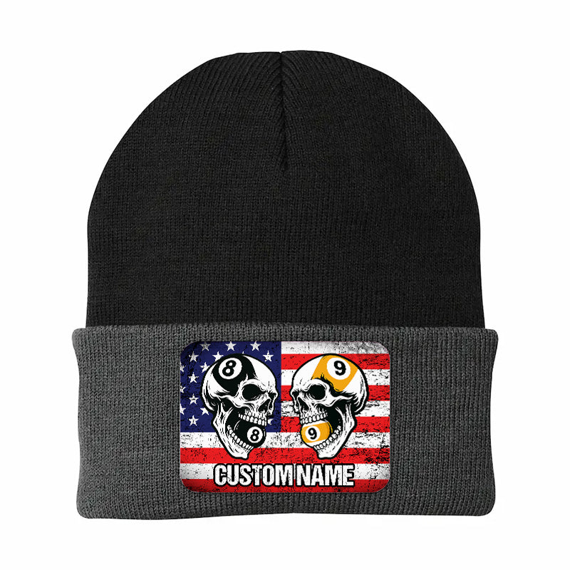 Funny Skull 8&9 Ball Billiard Knit Beanie Hat Rectangle Patch Custom US Flag Pool Player Knit Hat TDM4942