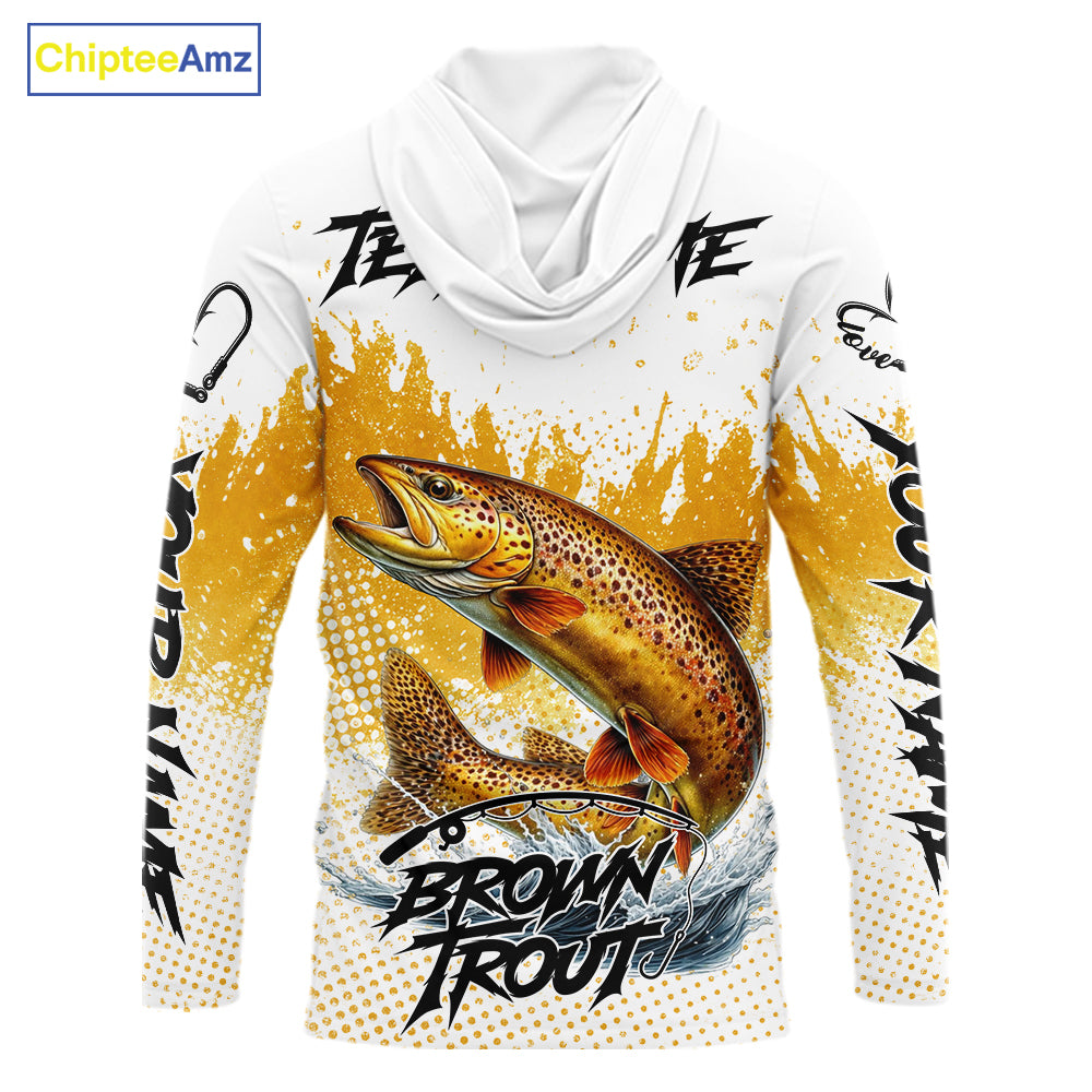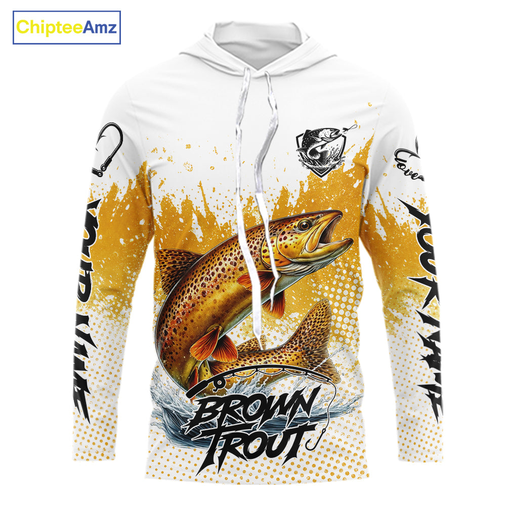 Custom Brown Trout Long Sleeve Hooded Fishing Shirts Yellow Camo Fishing Lures, Custom Fishing Jerseys NBT377