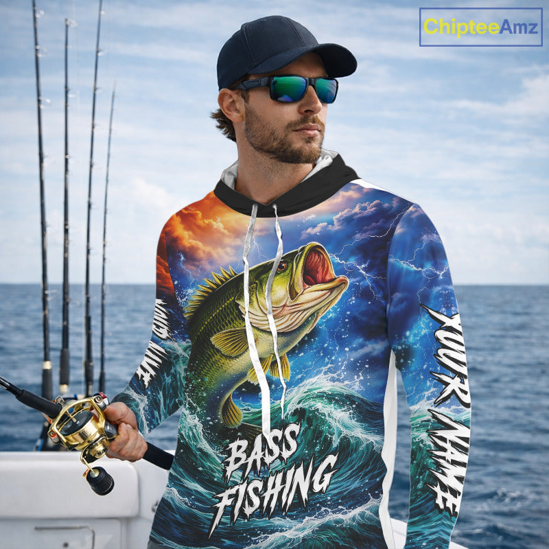 Personalized Bass Thunder And Lightening Long Sleeve Hooded Fishing Shirts, Custom Bass Fishing Jerseys NBT378