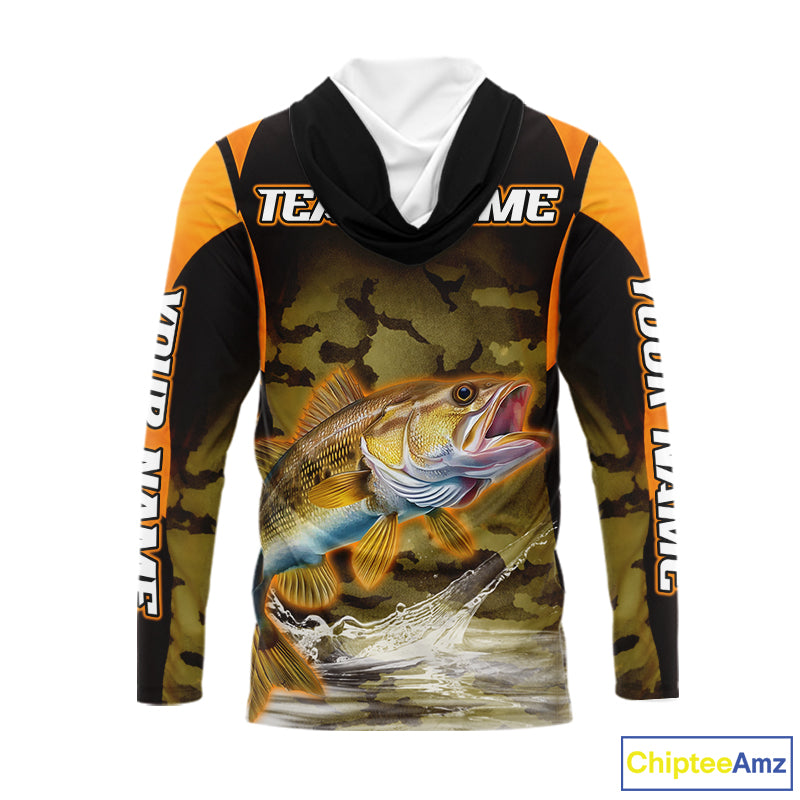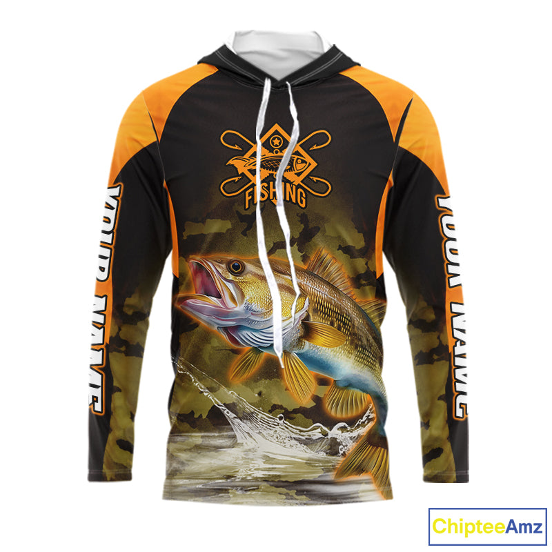 Personalized Walleye Long Sleeve Hooded Fishing Shirts Orange Camouflage, Walleye Fishing Shirts NBT395