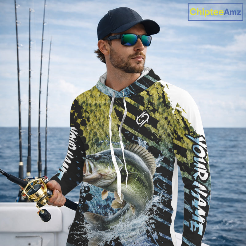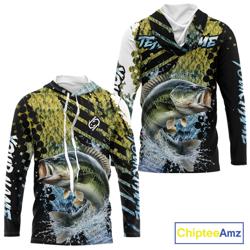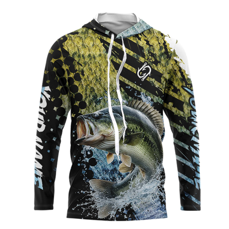 Bass Fishing Shirts Long Sleeve Hooded Dark Water Art Style Personalized Name, Fishing Gift NHT405