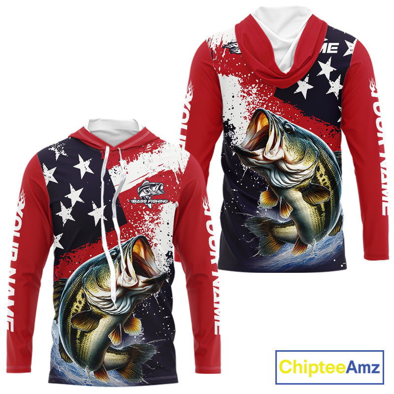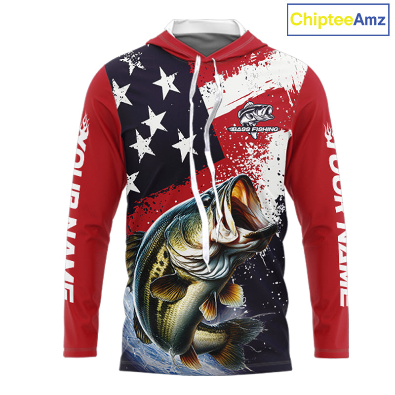 Personalized Bass Fishing Jerseys, Custom American Flag Bass Fishing Shirts Long Sleeve NHT414