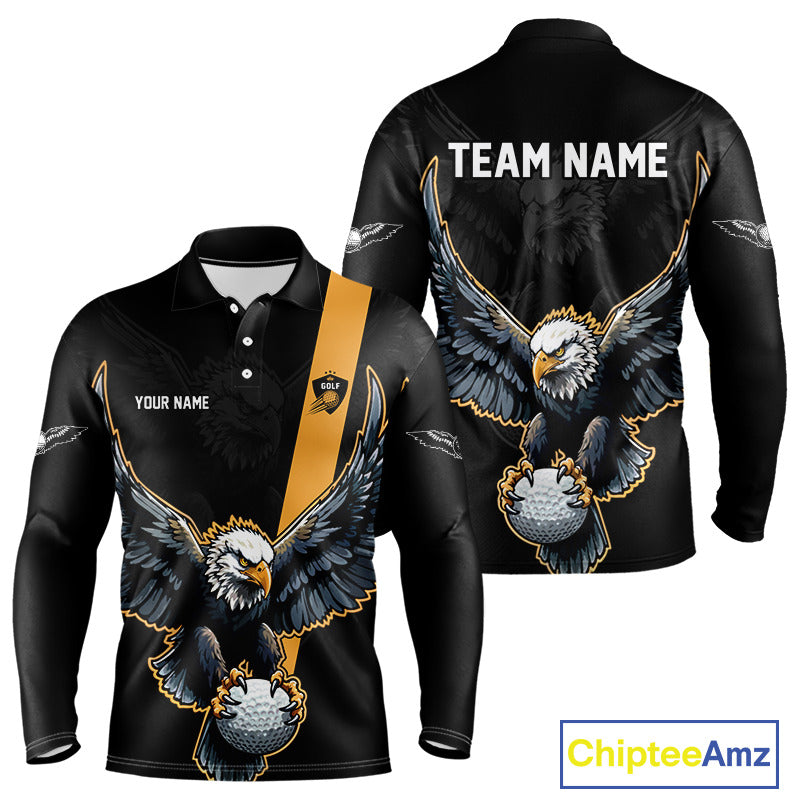 Long Sleeve Golf Polo Shirt Custom Eagle Golf Attire For Men, Black & Yellow Team Golf Top NHN0083