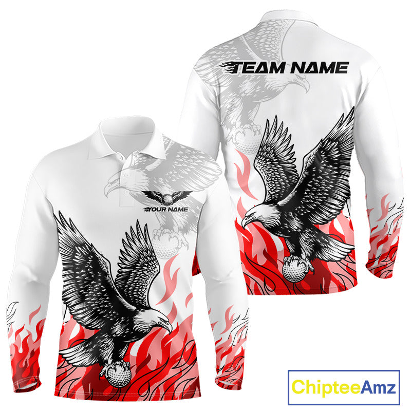 Long Sleeve Golf Polo Shirt Custom Eagle Red Flame Team Golf Tops, White Golf Outfit For Men NHN0070