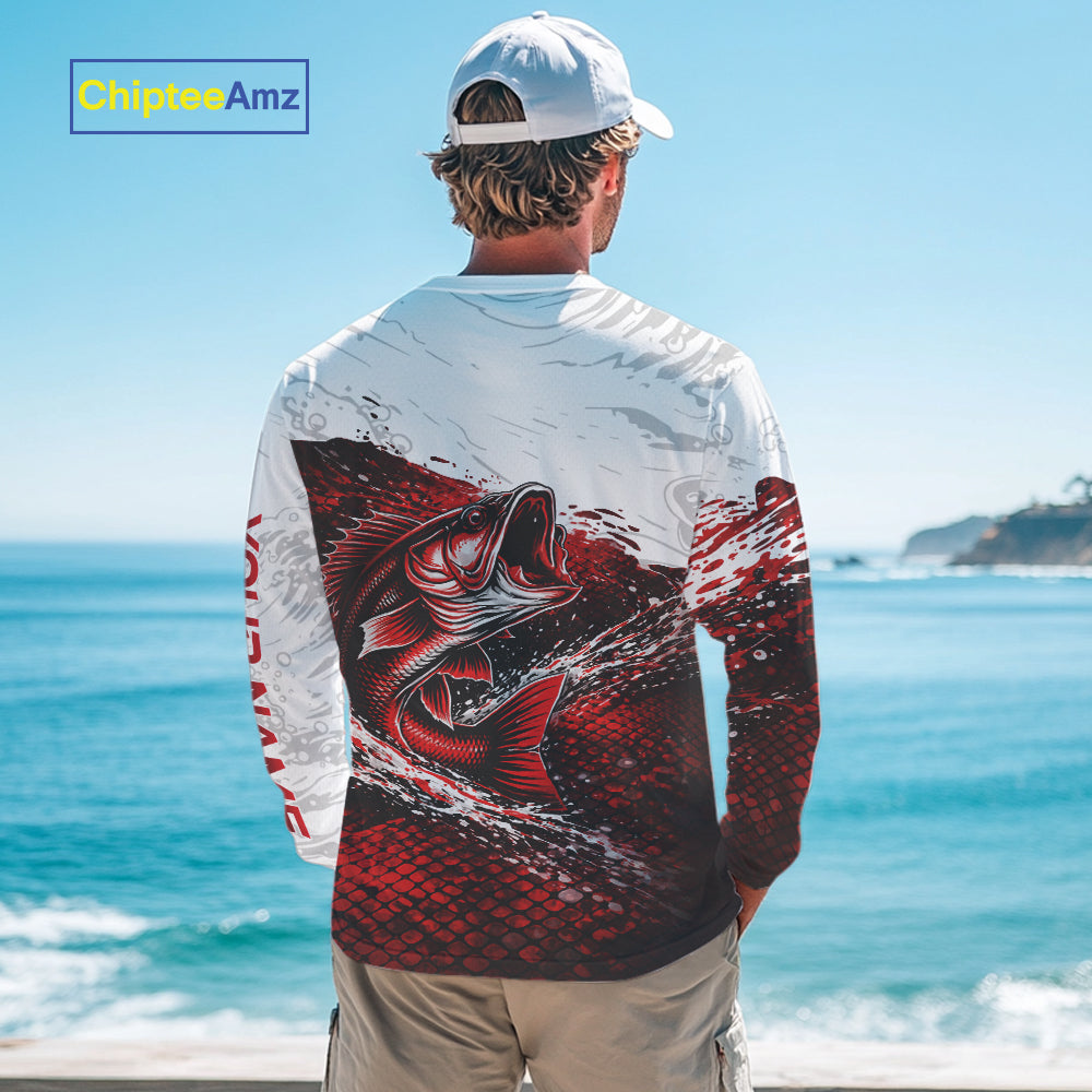 Custom Largemouth Bass Red Fish Scale Long Sleeve Fishing Shirts, Bass Fishing Jerseys|Red NBT344