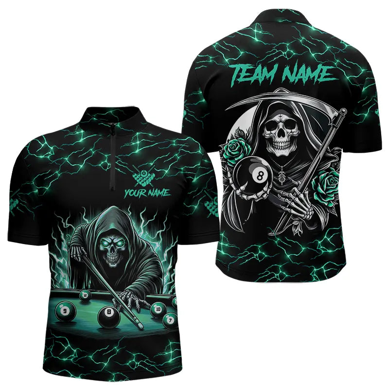 Turquoise Funny Death Skeleton Roses 8 Ball Pool Men Billiard Shirts Custom Thunder Billiard Jersey TDM3630