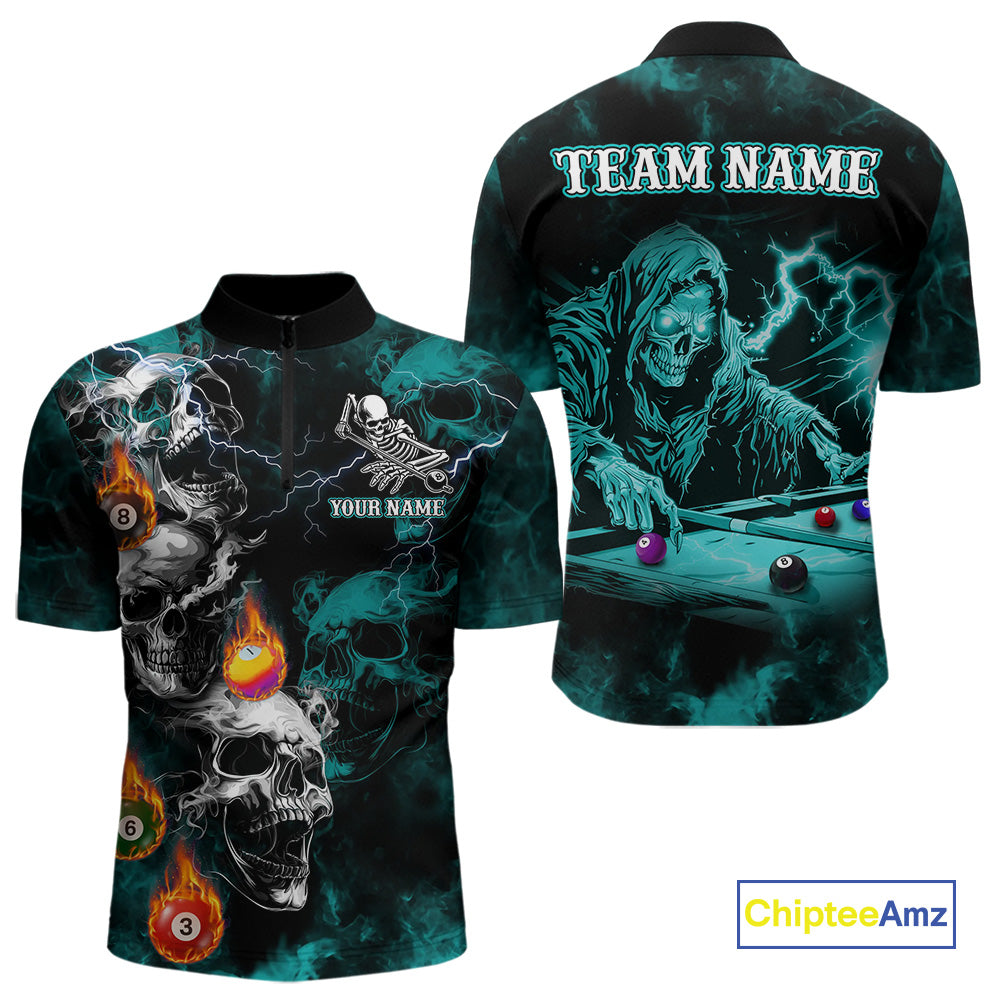 Personalized Turquoise Smoke Skull Billiard Shirts For Men Custom Death Skeleton Billiard Jerseys TDM3871