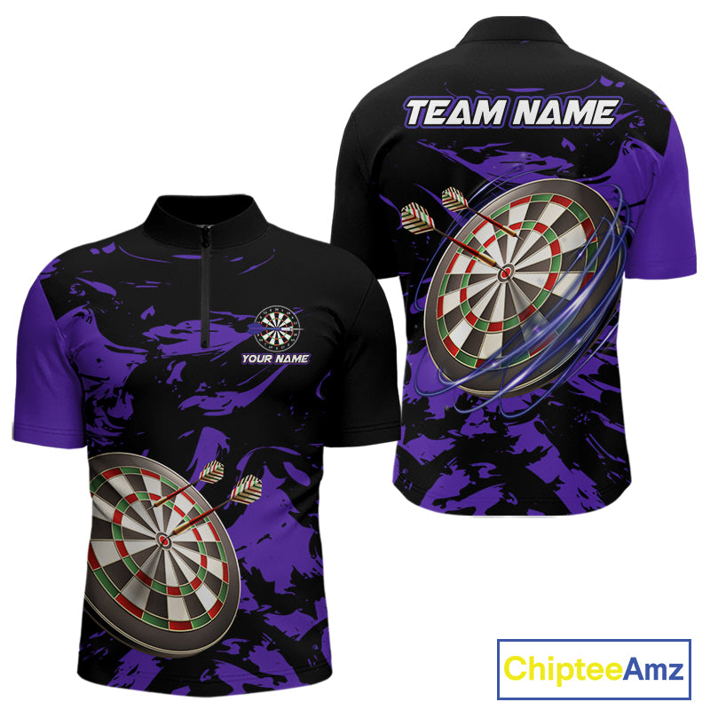 Personalized Black And Purple Splash Dart Polo & Quarter Zip Custom Dart Shirt For Men Darts Jersey TDM4169