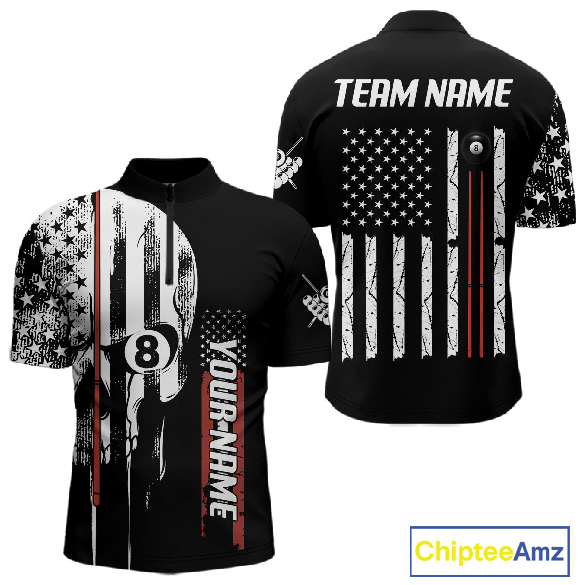 Personalized 8 Ball Skull Billiard Shirt For Men, American Flag Pool Team Jerseys Polo & 1/4 Zip TDM4629