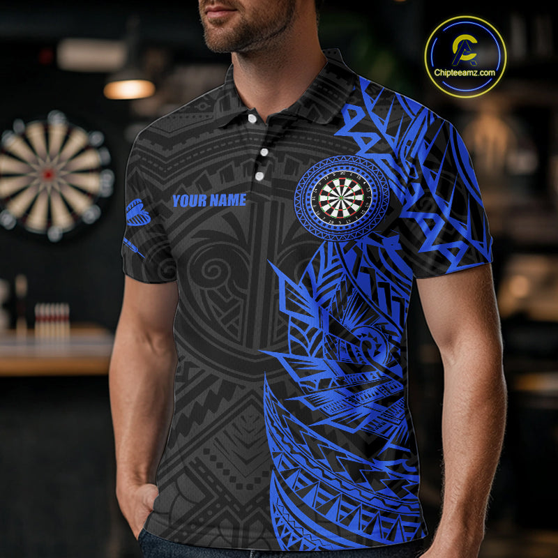Personalized Black And Blue Tribal Darts Polo & Quarter Zip Custom Dart Shirts For Men Dart Jersey TDM4826