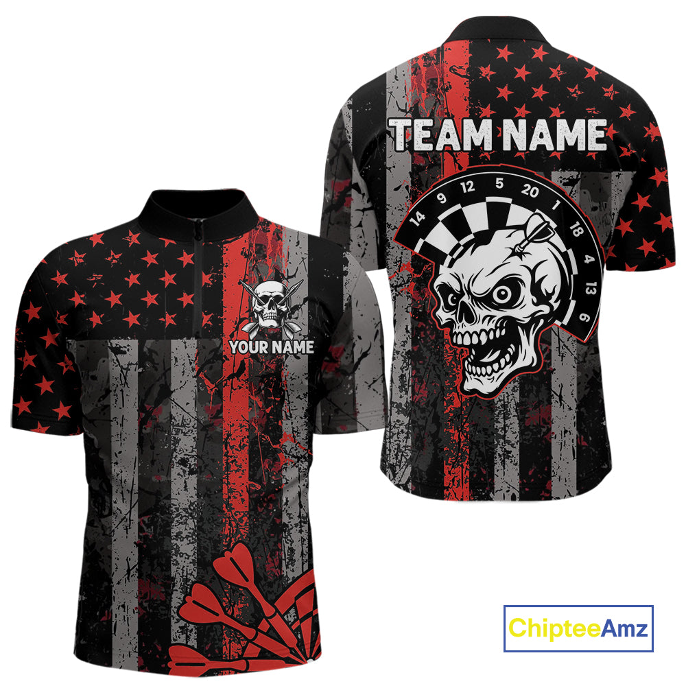 Personalized Red Grunge US Flag Skull Darts Shirt For Men Custom Patriotic Darts Team Jersey TDM4882