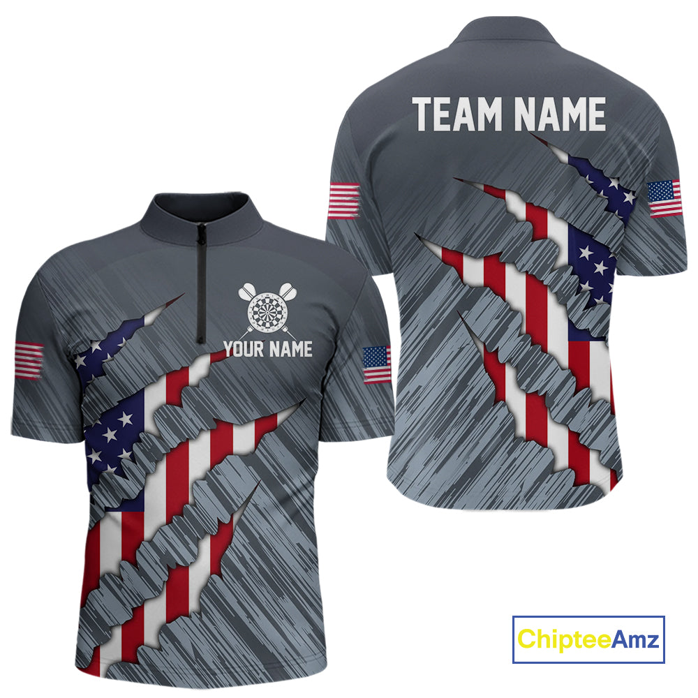 American Flag Grey Grunge Darts Polo & Quarter Zip Custom Dart Shirt For Men Patriotic Dart Jersey TDM4998
