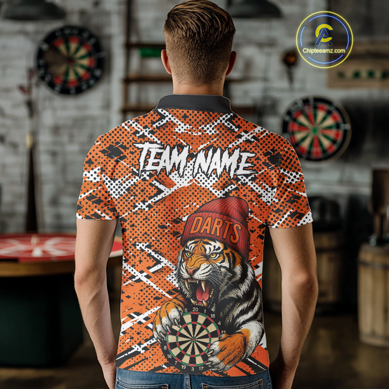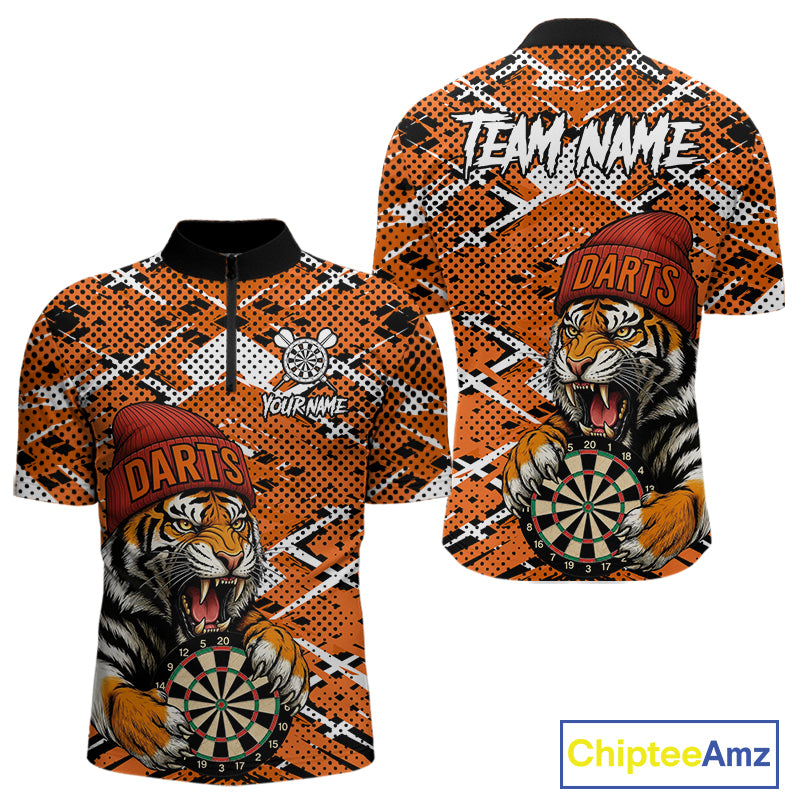 Personalized Orange Black Grunge Tiger Darts Shirt For Men Custom Darts Team Jersey Polo & 1/4 Zip TDM5099