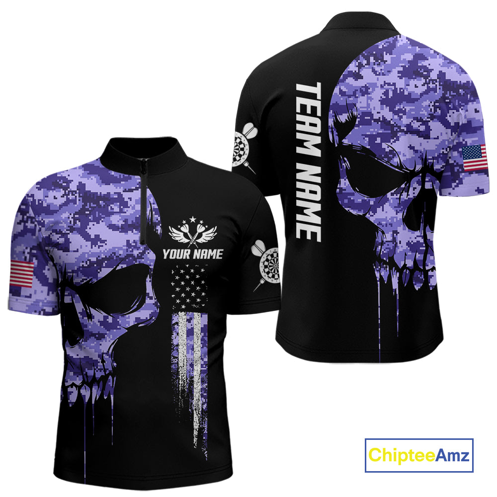 Purple Camouflage Skull Darts Shirt For Men Custom Patriotic US Flag Darts Jersey Polo & 1/4 Zip TDM5250