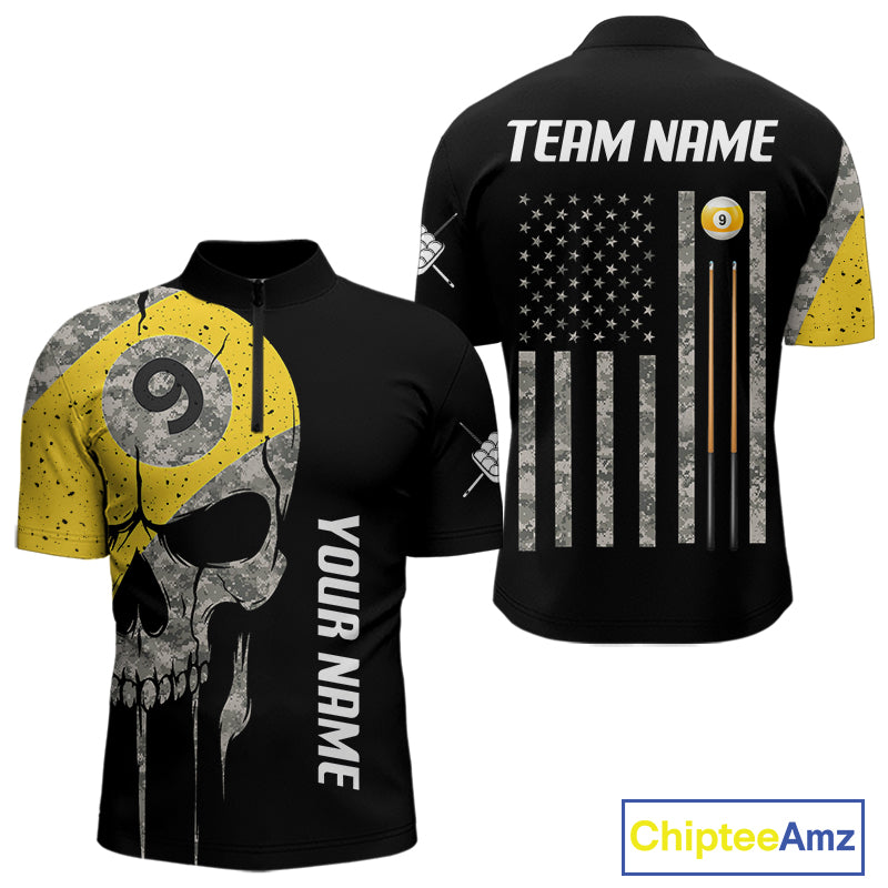 Personalized 9 Ball Camo Skull Billiard Shirt For Men, US Flag Pool Team Jerseys Polo & 1/4 Zip TDM5251
