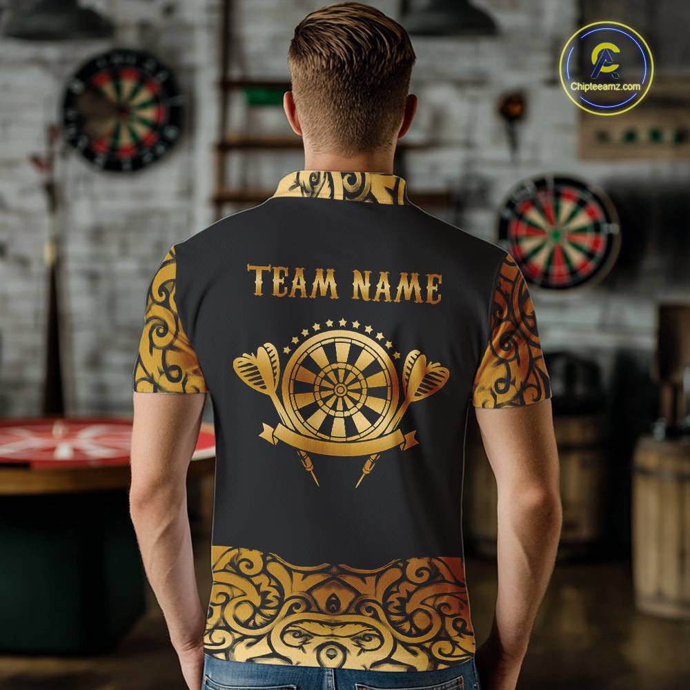Black And Gold Custom Tribal Darts Shirt For Men, Personalized Darts Jersey Team Polo & Quarter Zip TDM5392