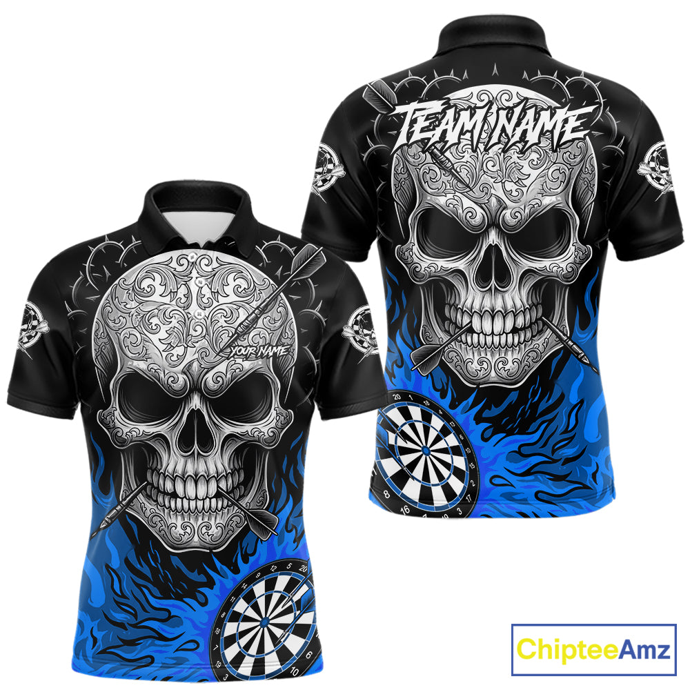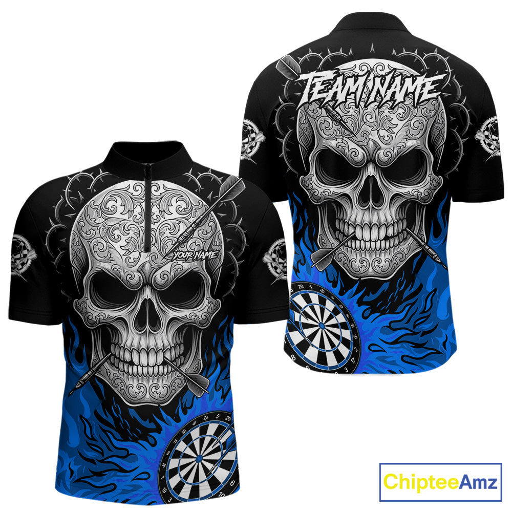 Black And Blue Flaming Skull Darts Shirt For Men Custom Darts League Jersey Team Polo & 1/4 Zip TDM5436