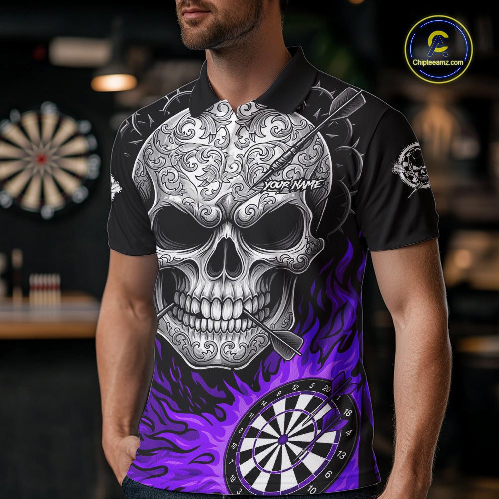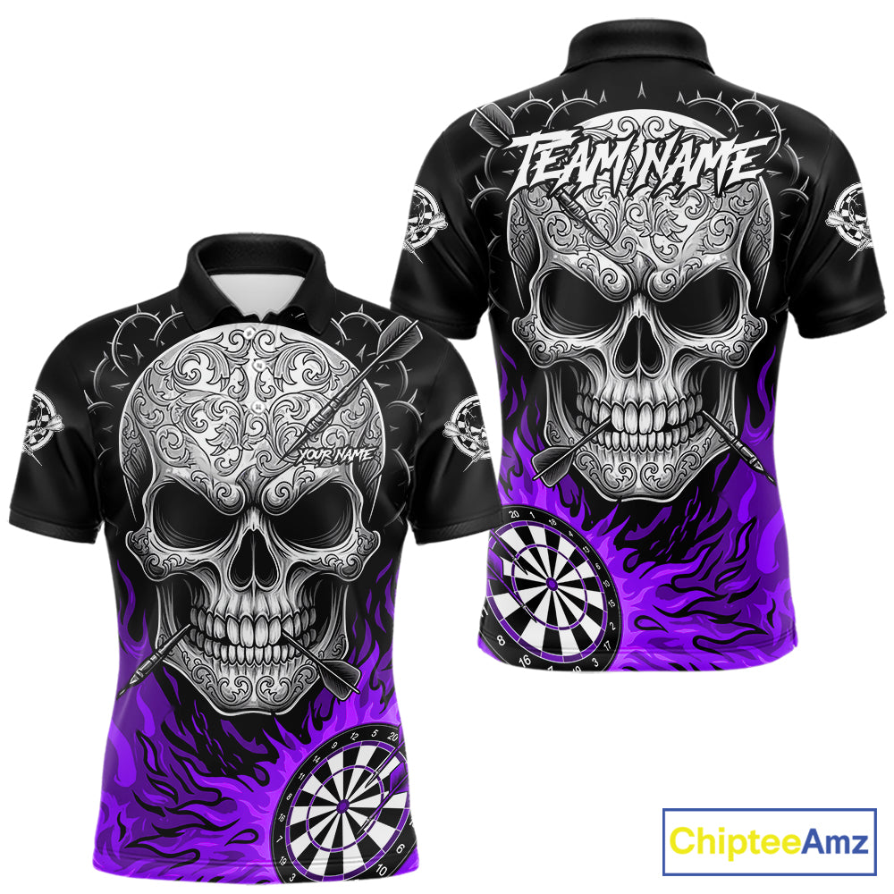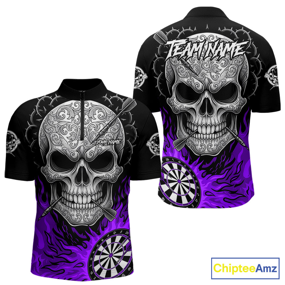Black And Purple Flaming Skull Darts Shirt For Men Custom Darts League Jersey Team Polo & 1/4 Zip TDM5437