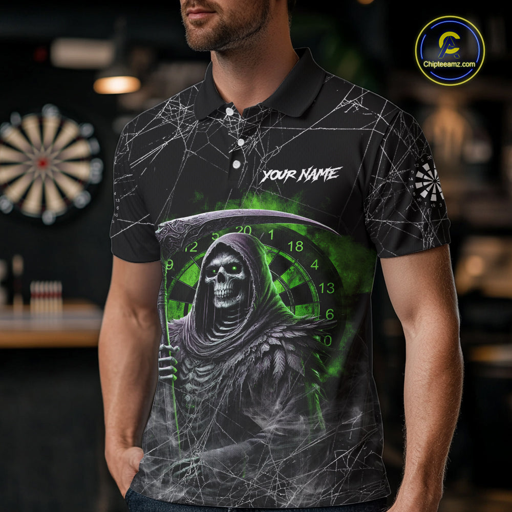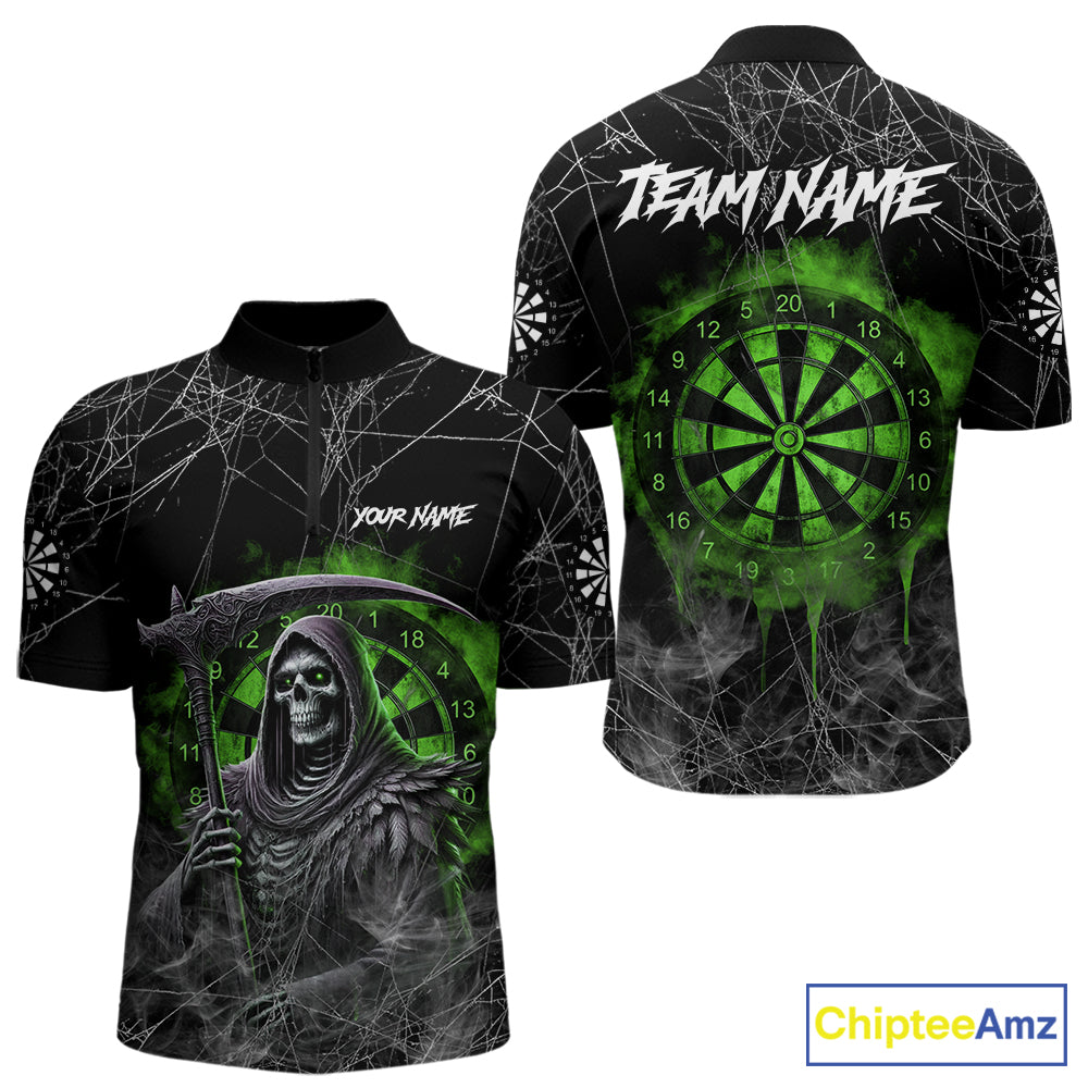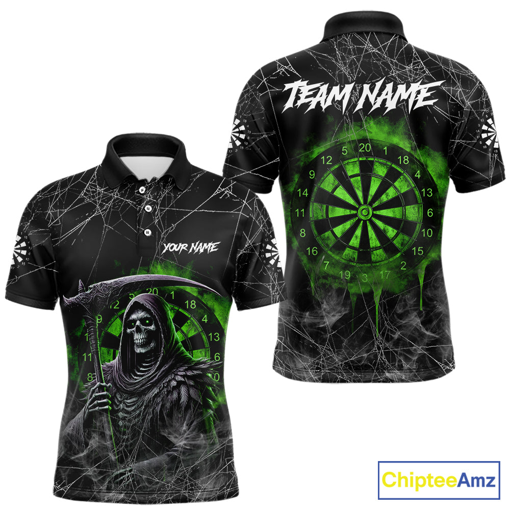 Black And Green Smoke Grim Reaper Funny Dart Shirts For Men Custom Dart Jerseys, Darts Clothing TDM5486