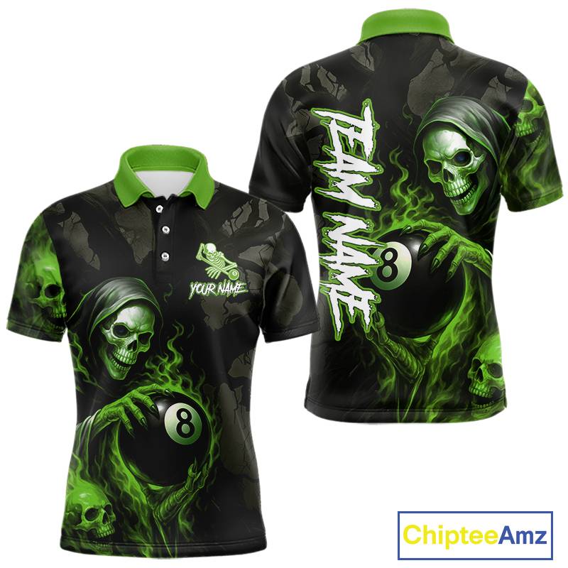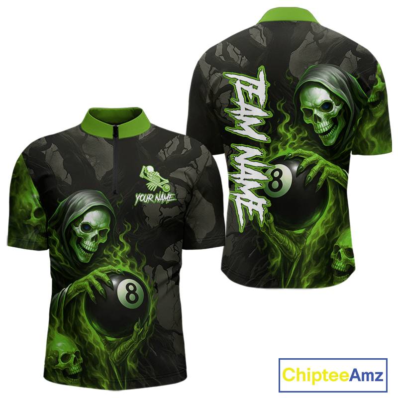 Grim Reaper Custom Flame 8 Ball Pool Billiard Shirt For Men, Black And Green Billiard Team Jersey TDM5532