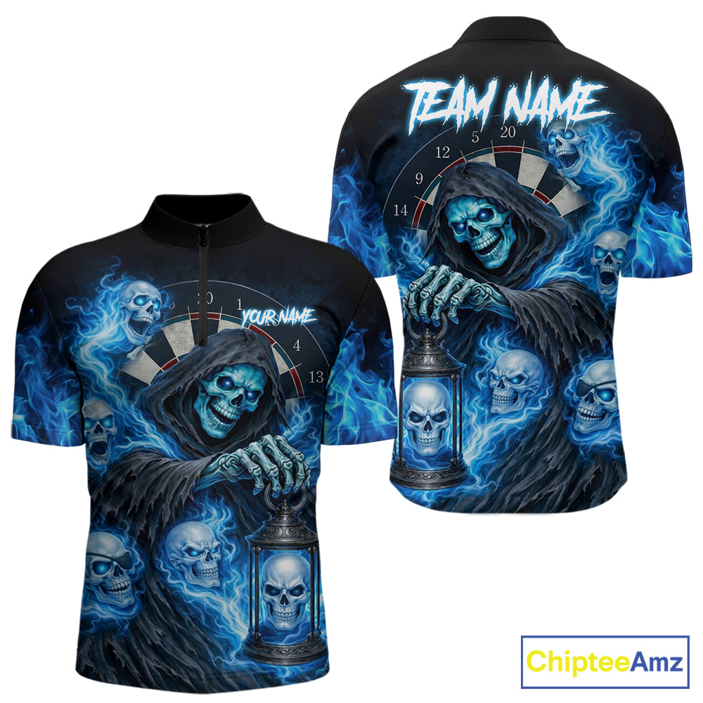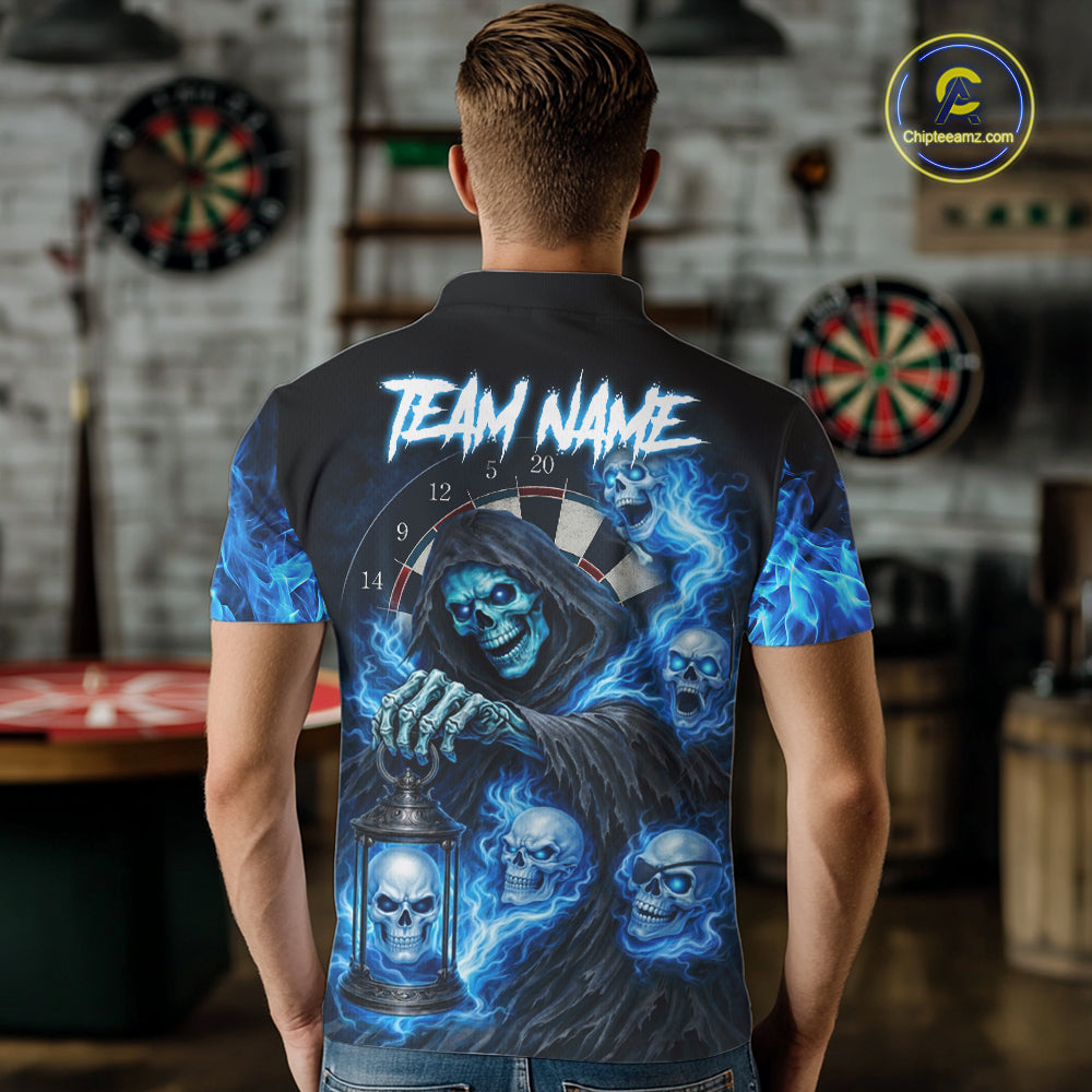 Blue Grim Reaper Flame Darts Shirt For Men Custom Skull Darts League Jersey Team Polo & Quarter Zip TDM5560