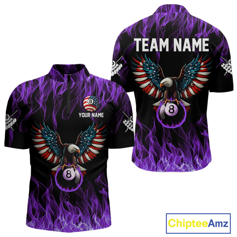 Purple Flaming American Flag Eagle 8 Ball Billiard Shirt For Men Custom Patriotic Pool Team Jersey TDM5588