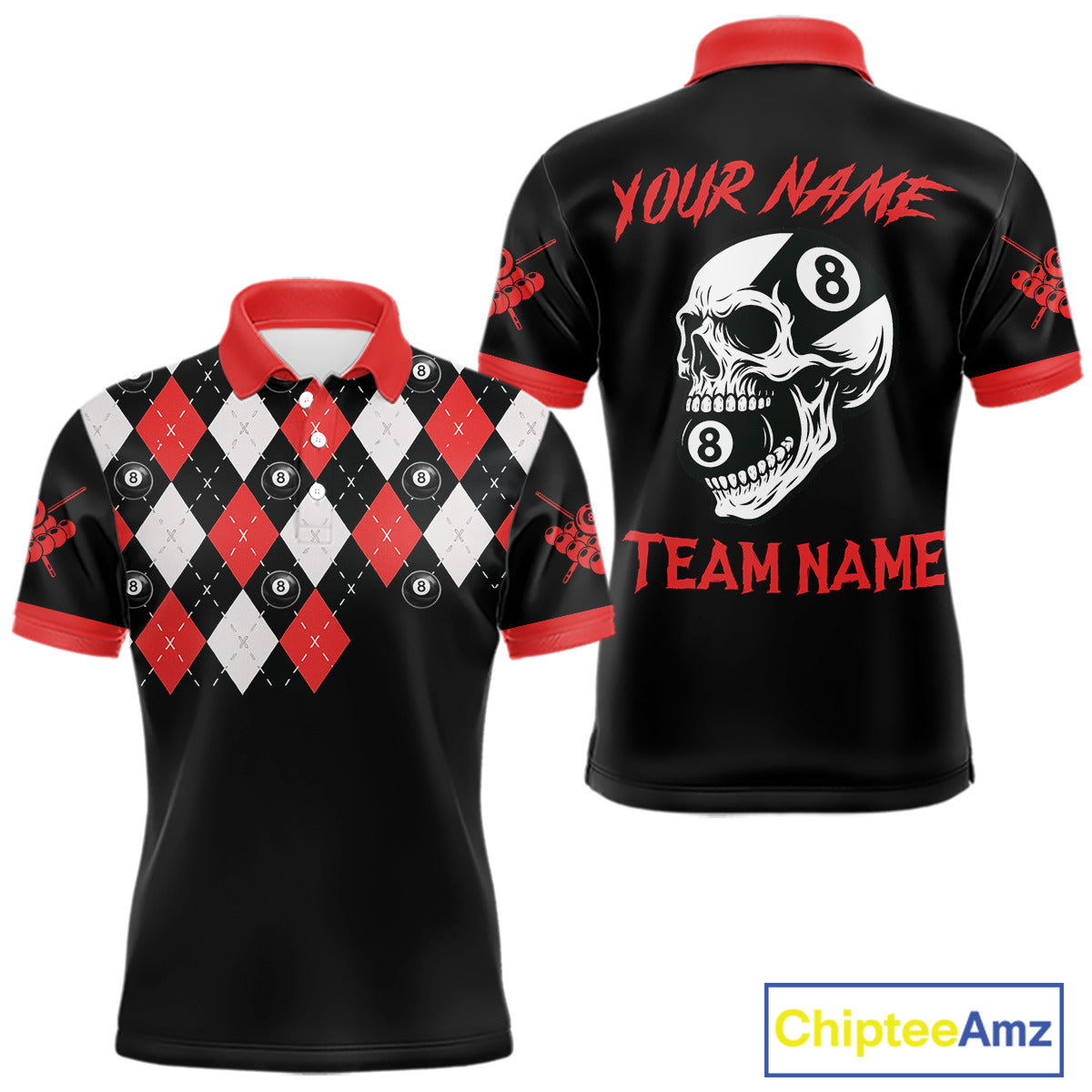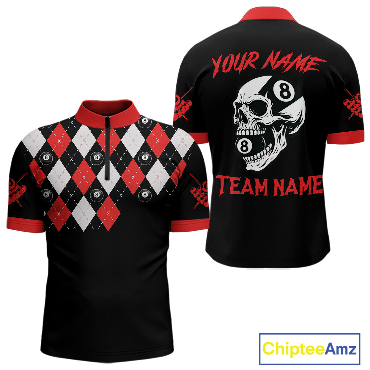 Personalized 8 Ball Pool Skull Argyle Pattern Men's Billiard Shirts, Billiard Team Jersey |Red TDM5719