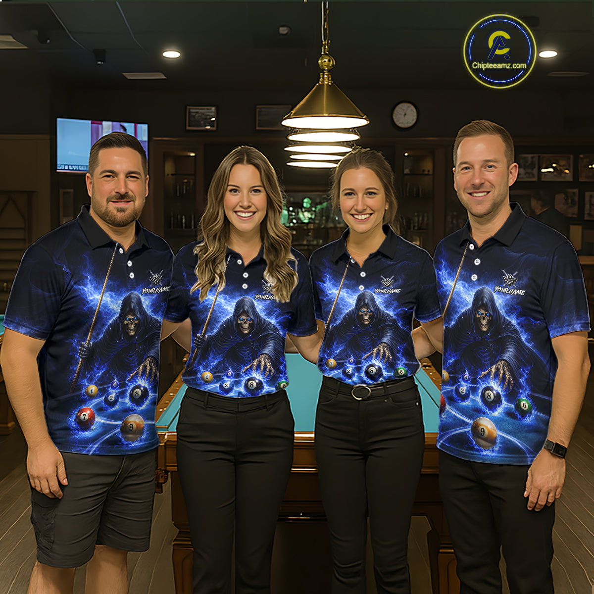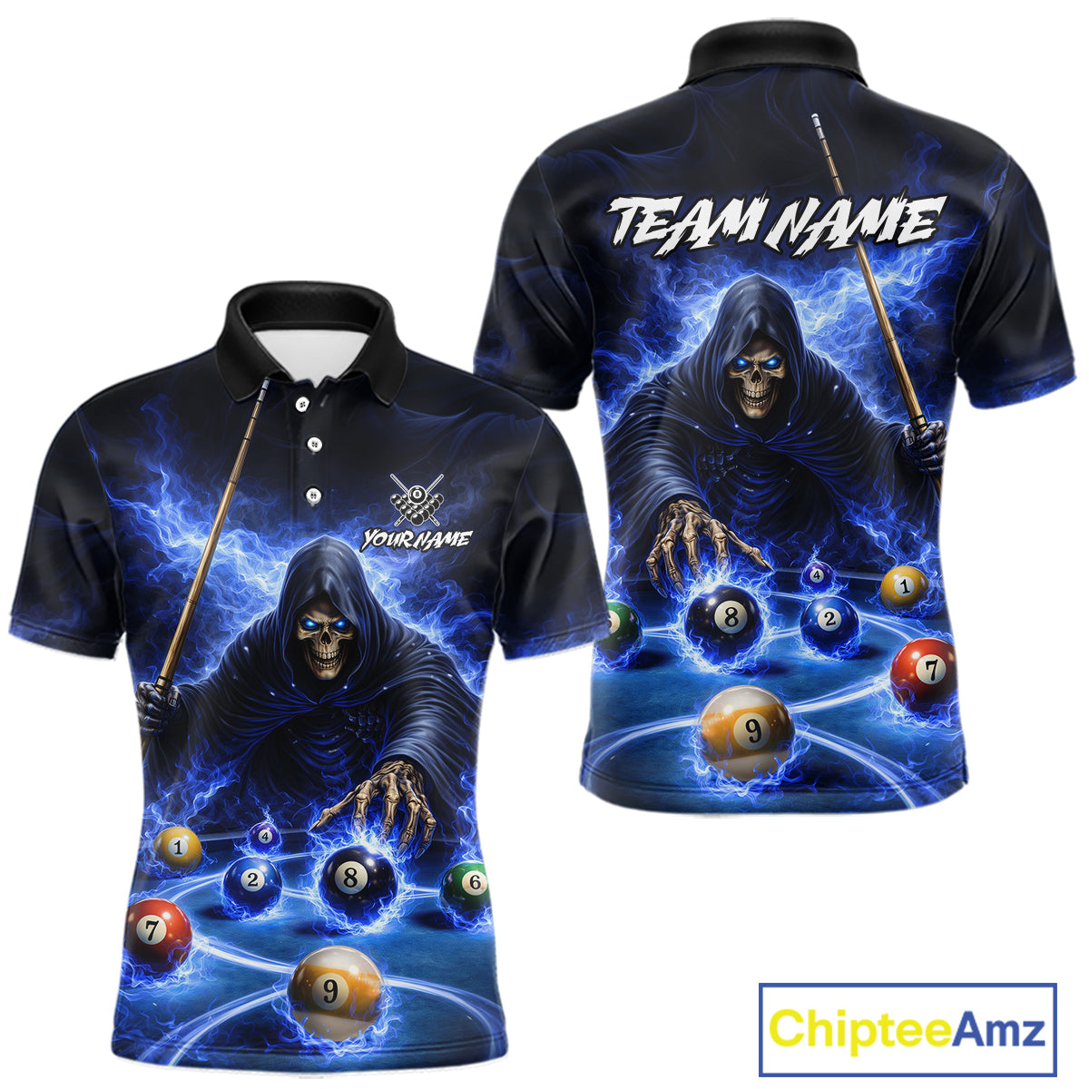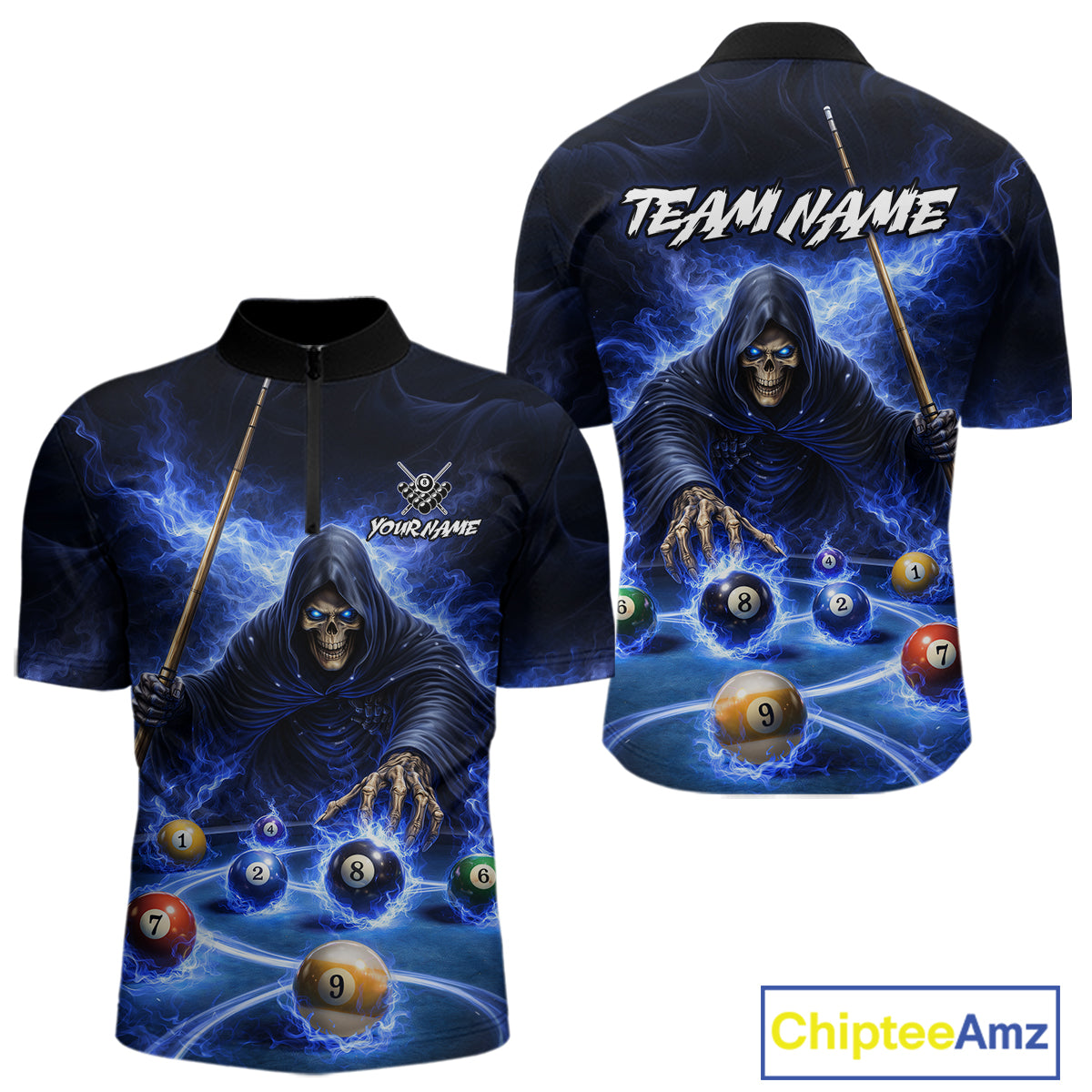 Blue Flaming Grim Reaper Billiard Shirt For Men Custom Pool Team Jersey Polo & Quarter Zip Shirt TDM5738