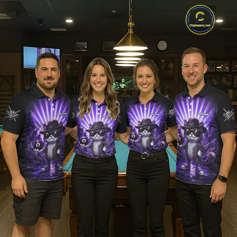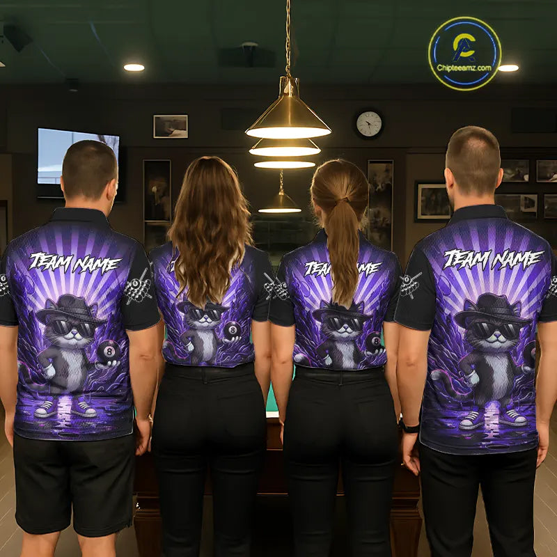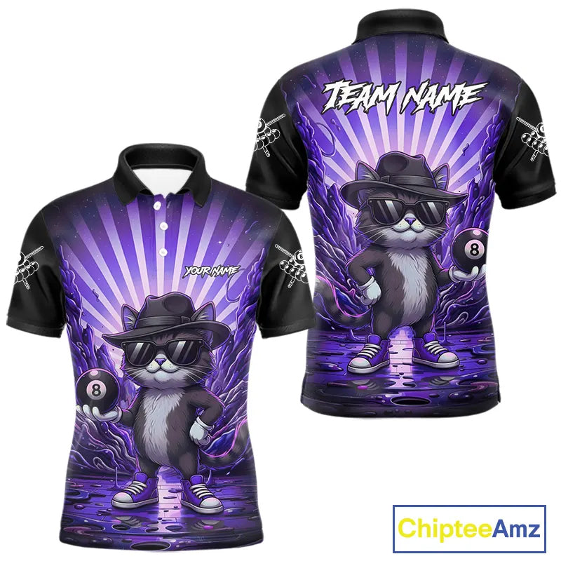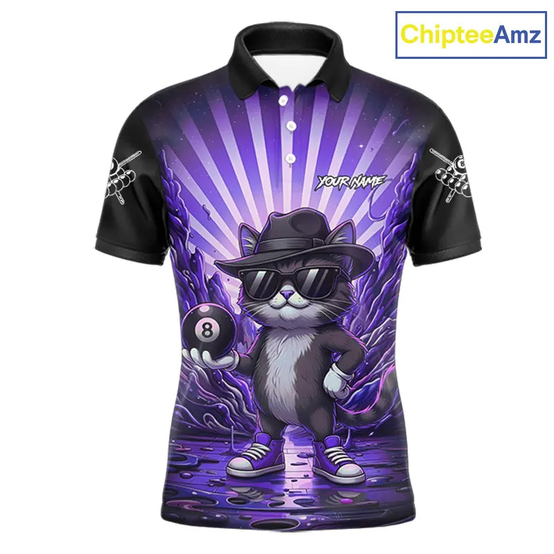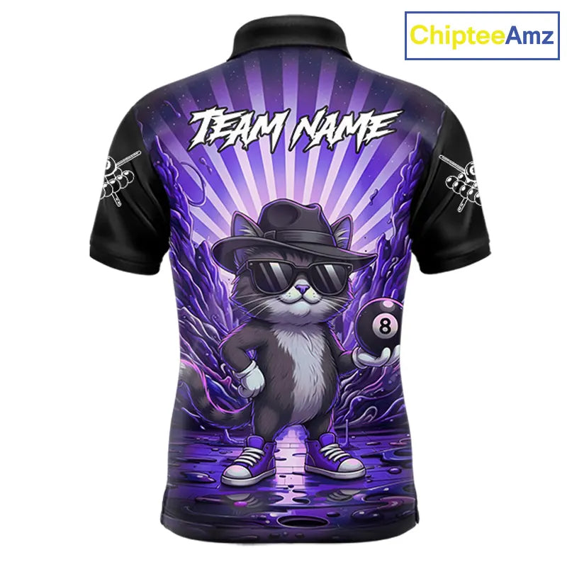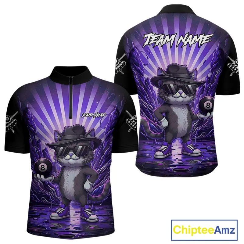 Funny Cat 8 Ball Billiard Shirt For Men Custom Purple Neon Graffiti Billiard Jersey Polo, 1/4 Zip TDM5743
