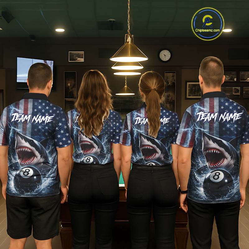American Flag Shark 8 Ball Billiard Shirt For Men Custom Lightning Patriotic Pool Team Jersey TDM5769