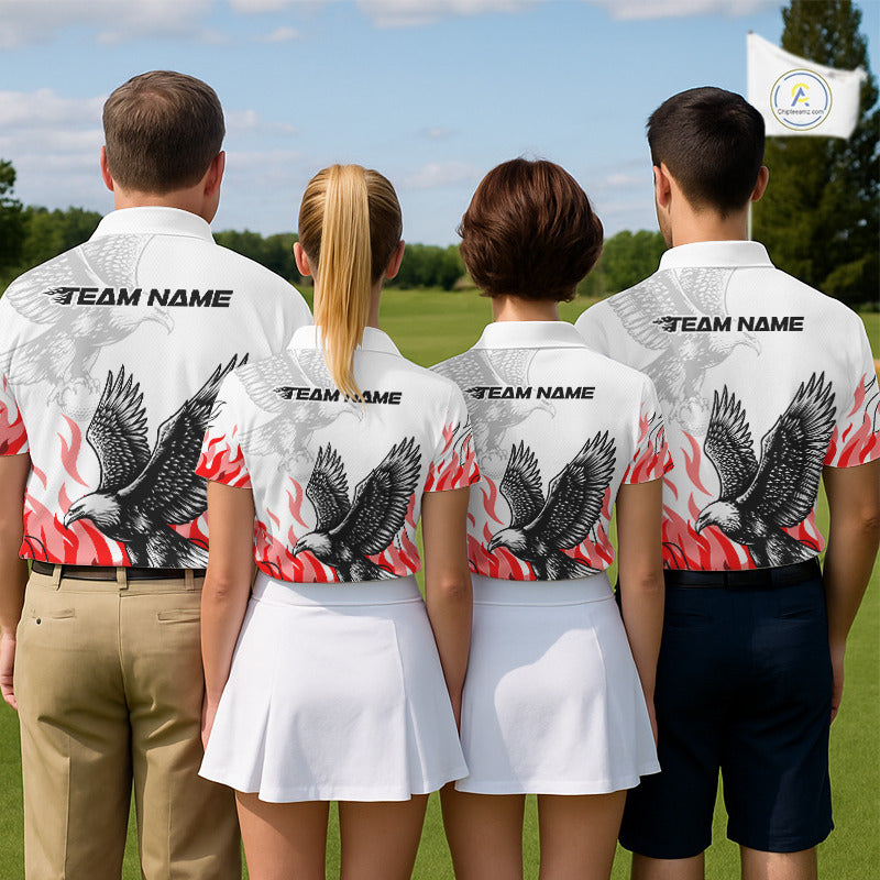 Mens Golf Polo Shirt Custom Eagle Red Flame Team Golf Tops, White Golf Outfit For Men NHN0070