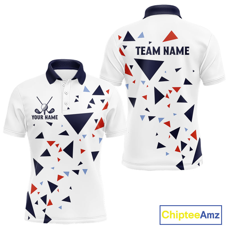 Mens Golf Polo Shirt Custom Orange And Blue Triangle Pattern Team Golf Tops, White Golf Attire NHN0086