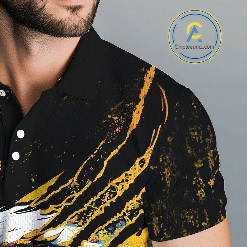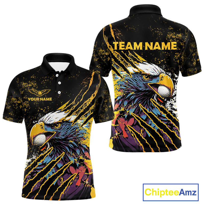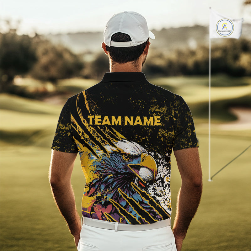 Mens Golf Polo Shirt Custom Yellow And Black Grunge Ripped Eagle Grasping Golf Ball Golf Apparel NHN0057